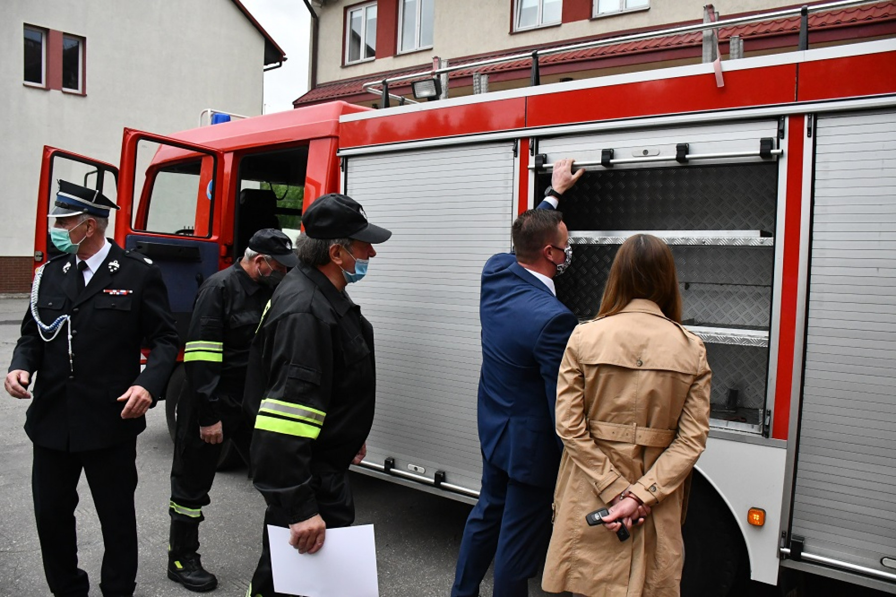 Samorządowcy i strażacy oglądają pojazd bojowy OSP Nieszków
