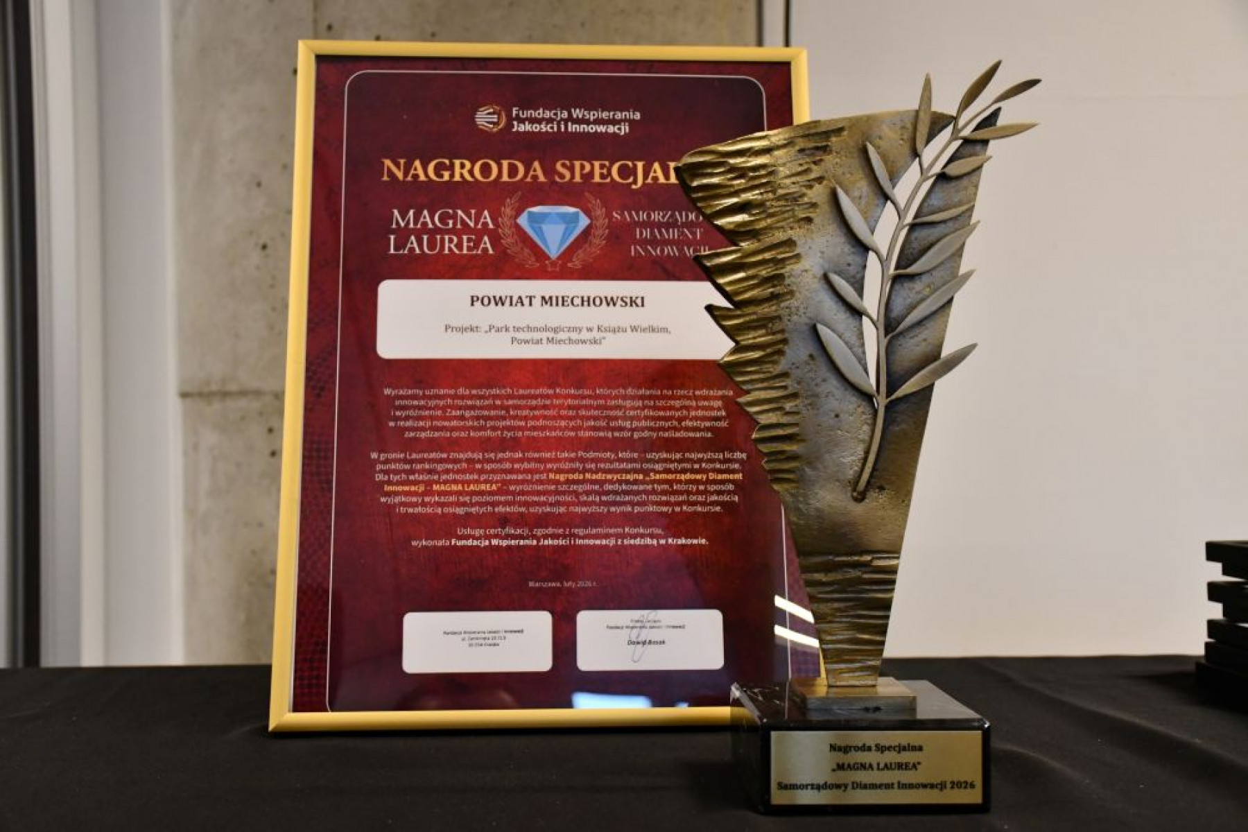 W poniedziałek 16 lutego podczas uroczystej Ogólnopolskiej Gali Finałowej Konkursu „Samorządowy Diament Innowacji” w Warszawie, Powiat Miechowski został podwójnie nagrodzony uzyskując Nagrodę Specjalną Magna Laurea Samorządowy Diament Innowacji, a także certyfikat oraz znak jakości Fundacji Wspierania Jakości i Innowacji za Park Technologiczny w Książu Wielkim, Powiat Miechowski.