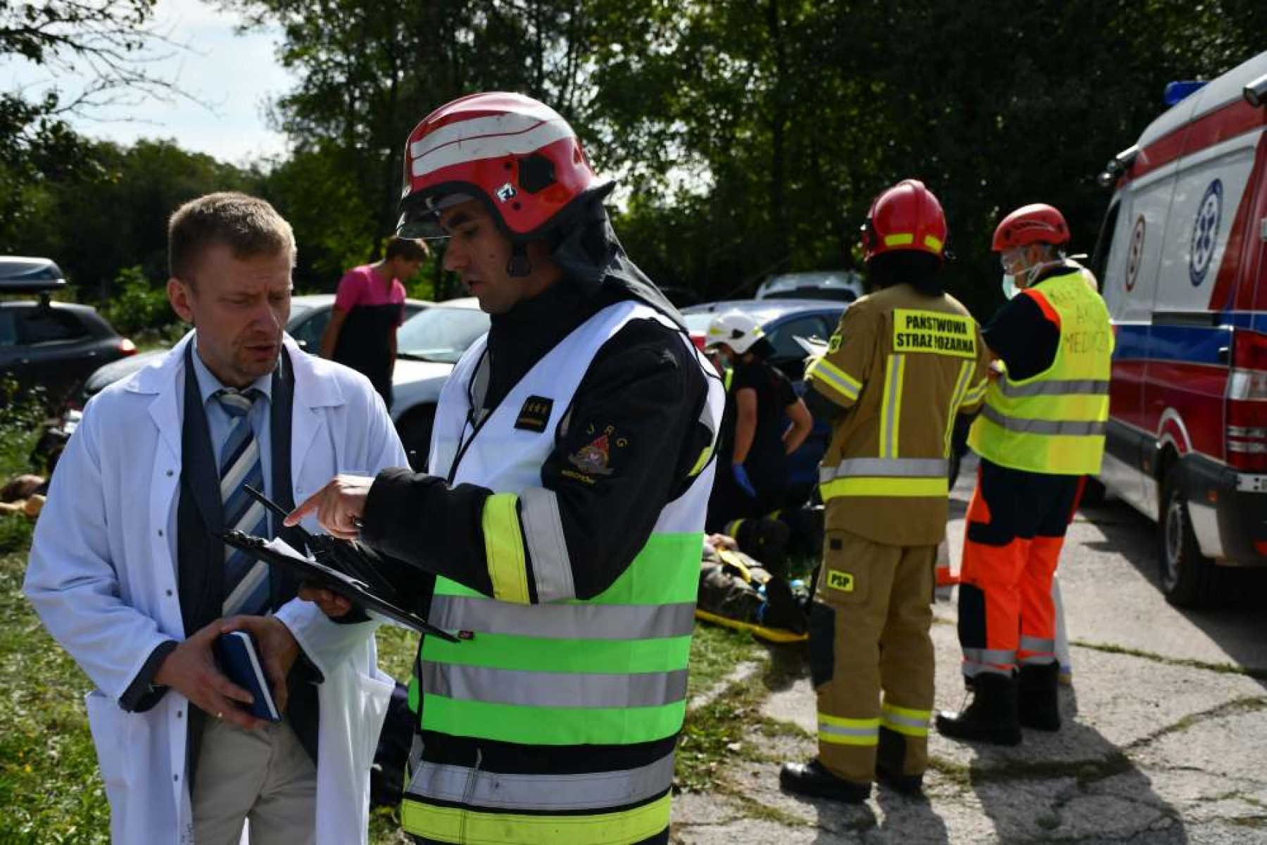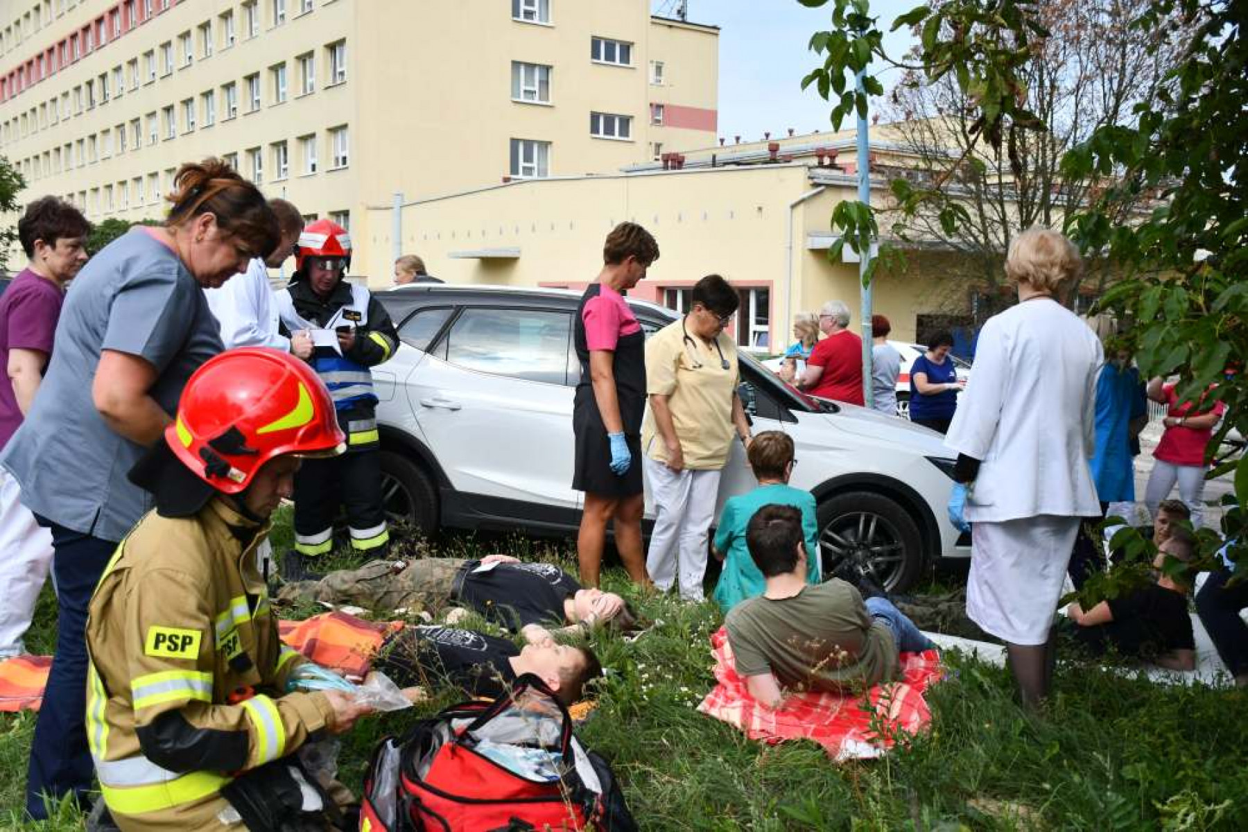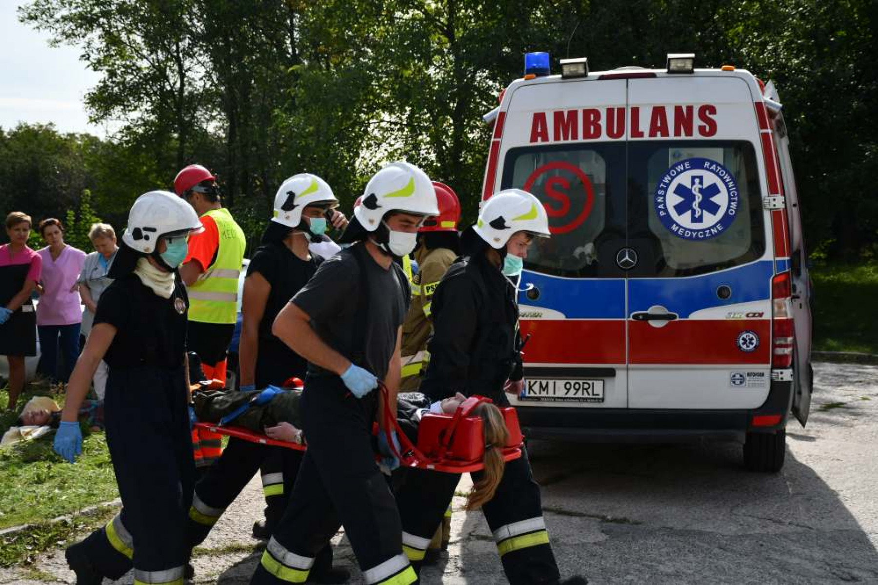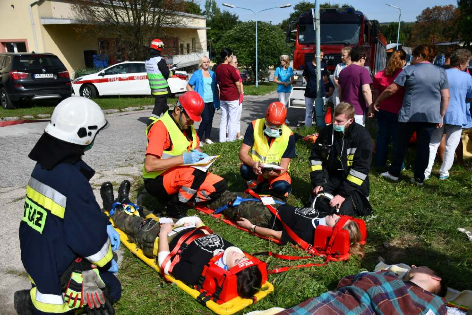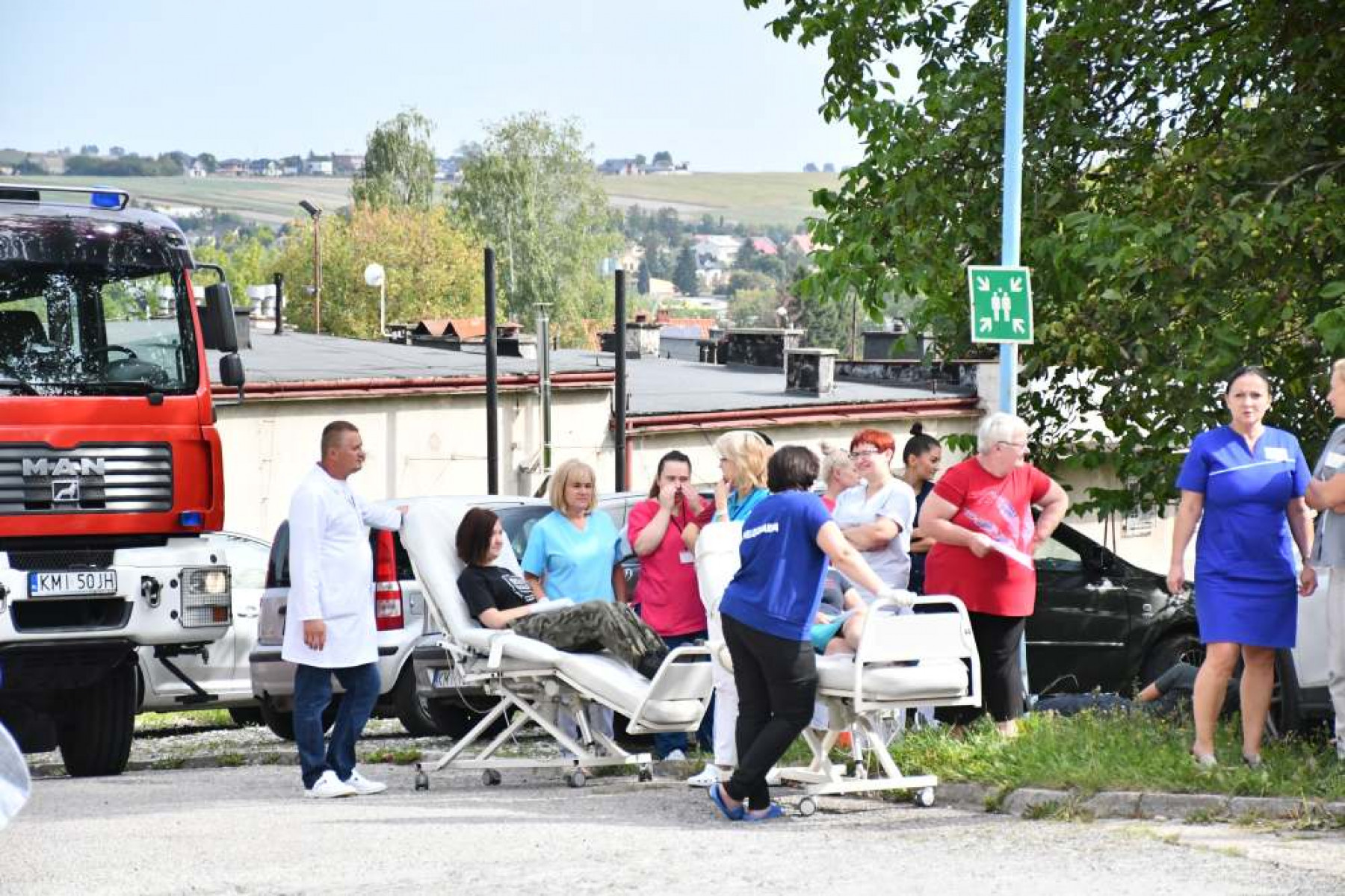 To tylko fragment scenariusza powiatowych ćwiczeń, które skoncentrowały przy obiekcie miechowskiego szpitala szereg jednostek Straży Pożarnej, Policji i Państwowego Ratownictwa Medycznego. W akcji uczestniczyli strażacy zawodowi z Jednostek Ratowniczo Gaśniczych z Miechowa, Proszowic i Olkusza. Wspierali ich ochotnicy z terenu powiatu miechowskiego - OSP Przybysławice, OSP Charsznica, OSP Bukowska Wola, OSP Kalina Wielka, OSP Falniów oraz spoza Miechowszczyzny - OSP Bukowno Stare, OSP Dłużec, OSP Bydlin. Ćwiczenia koordynowało Powiatowe Centrum Zarządzania Kryzysowego w obecności starosty powiatu miechowskiego - Jacka Kobyłki. Kierownikiem ćwiczeń był komendant KP PSP mł. bryg. Michał Majda, a działaniami ratowniczymi kierowali - zastępca komendanta st. kpt. Mariusz Idzik oraz dowódca JRG - mł. bryg. Paweł Miś. Pozorację zapewnili uczniowie Zespołu Niepublicznych Szkół i Placówek Oświatowych z Książa Wielkiego.