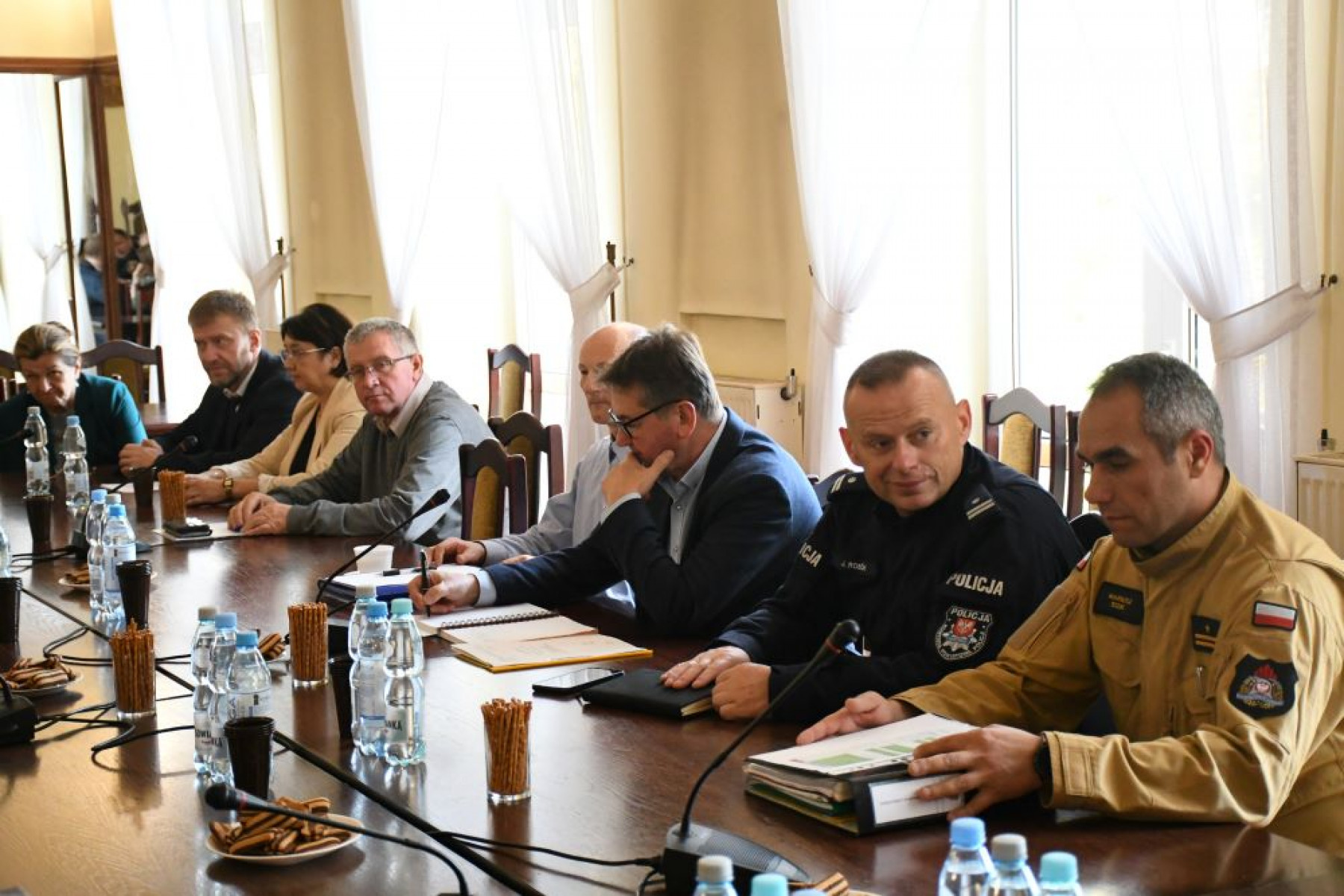 Jako pierwszy wystąpił p.o. Komendanta Powiatowego Państwowej Straży Pożarnej - mł. bryg. Mariusz Idzik. Poruszył ważną kwestię będącą pokłosiem czerwcowej katastrofy budowlanej w Falniowie, w wyniku której zginęła jedna osoba oraz zwierzęta gospodarskie. Komendant zwrócił uwagę na koordynację i komunikację na poziomie służby - osoby odpowiedzialne za działania kryzysowe w gminach. Nie ma z tym problemu w dni powszednie w godzinach roboczych. Problem pojawia się po tym czasie. Brakuje kontaktów bezpośrednich do osób odpowiedzialnych w poszczególnych gminach. Dlatego też komendant Idzik apelował do samorządów o zaktualizowanie corocznie zatwierdzanych gminnych planów ratowniczych, w których należy m.in. wskazać z dane kontaktowe osób dostępnych 24/h i odpowiedzialnych za różne sfery bezpieczeństwa, a także przedsiębiorców, gotowych w każdym momencie zabezpieczyć np. transport publiczny, materiały zabezpieczające typu piasek, worki, plandeki itp. Jak informował, za działania kryzysowe występujące na terenie jednej gminy, odpowiada właściwy wójt, burmistrz. Jeżeli zagrożenie wystąpi na szerszym terenie, to wtedy wkraczają kryzysowe służby powiatowe. Jednakże, w większości przypadków, kryzysowe służby powiatowe wspierają działania występujące na wąskim obszarze.