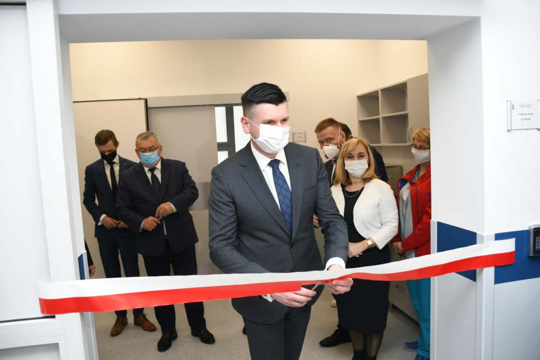 Podsekretarz Stanu MZ Marcin Martyniak przecina wstęgę na otwarciu Pracowni Rezonansu Magnetycznego w miechowskim szpitalu