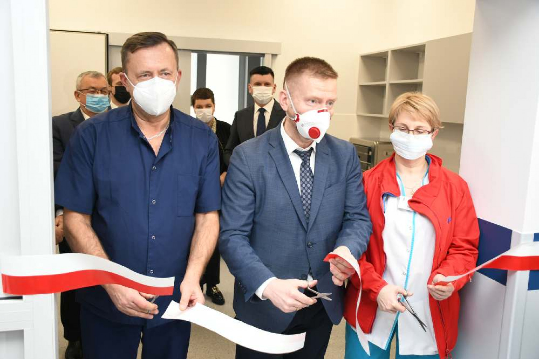 Minister Andrzej Adamczyk przecina wstęgę na otwarciu Pracowni Rezonansu Magnetycznego w miechowskim szpitalu