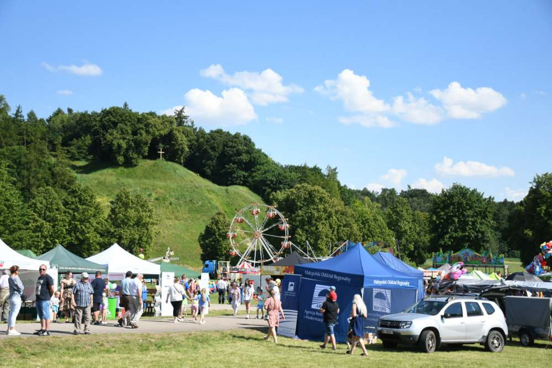 Wybory Chłopa Roku 2024 - stoiska i wesołe miasteczko z Kopcem Kościuszki w tle