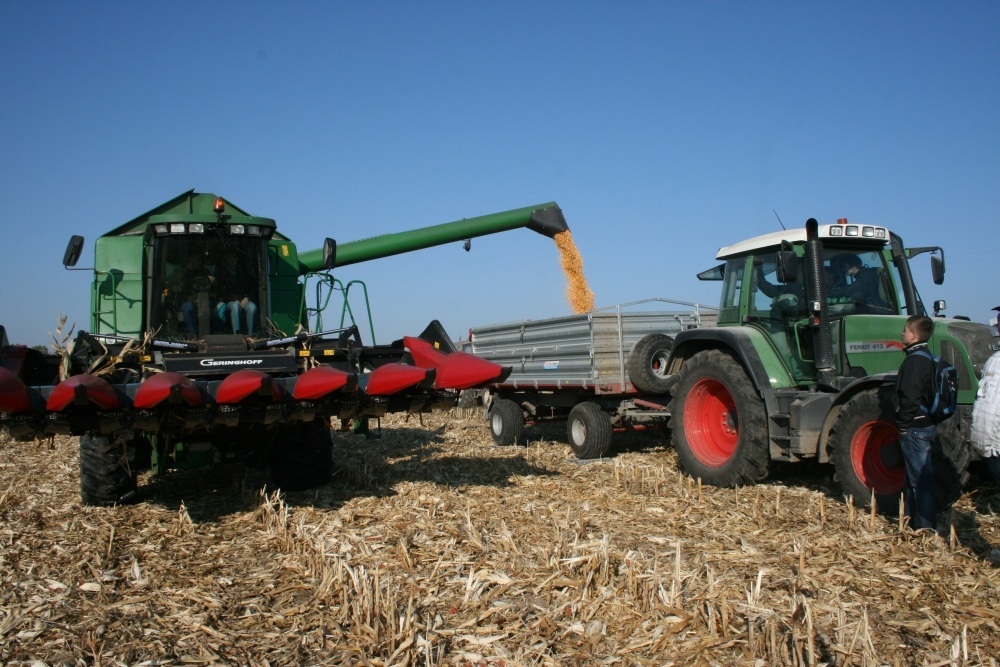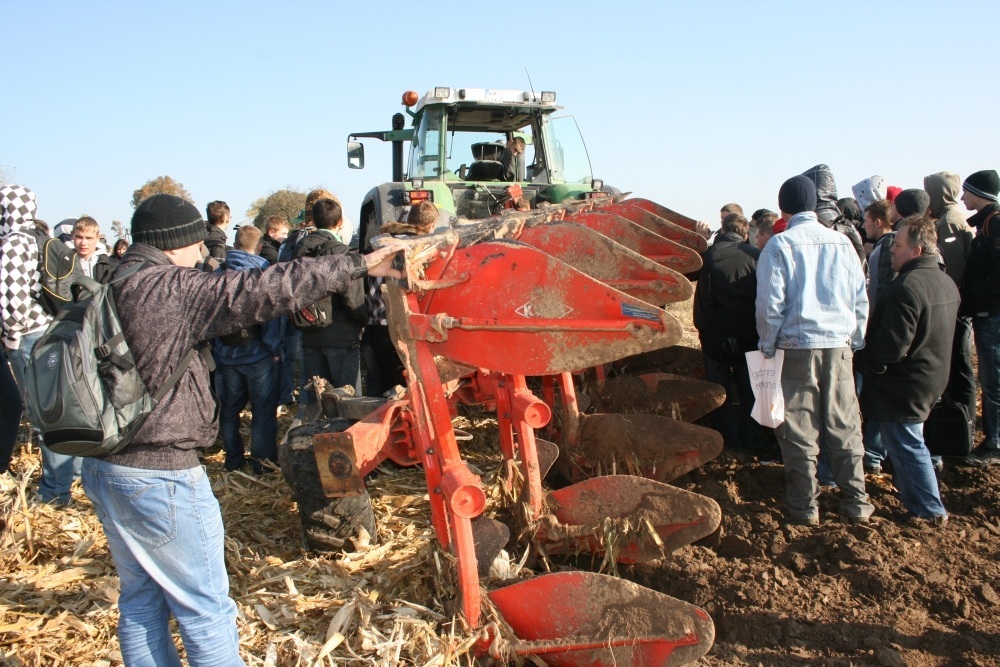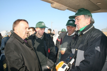(...) i jeden z dzierżawców gruntów powiatowych zaprosił młodzież wraz z nauczycielami do Wielkiej Wsi w gminie Książ Wielki, gdzie prowadzi uprawy na polach o pow. ponad 200 ha. W pokazowej lekcji uczestniczyli uczniowie klas I-III, przyszli technicy mechanizacji rolnictwa ZS Nr 2 w Miechowie razem z wicedyrektor Moniką Marzec i nauczycielem przedmiotów zawodowych Pawłem Ptakiem. Byli także uczniowie klas I-III technikum rolniczego z ZS w Książu Wielkim ze swymi nauczycielami – kierownikiem kształcenia praktycznego Witoldem Kozłowskim, Urszulą Molęcką i Janem Biesagą. Zajęciom na dzierżawnych gruntach przyglądali się wicestarosta Bogusław Miś i Marian Brodowicz, przewodniczący Rady Powiatu. ,,Bohaterem” słonecznego przedpołudnia na kukurydzianym polu było mechaniczne monstrum – wielozadaniowy kombajn 9560WTS ,,John Deere” do zbiorów zbóż. Tym razem łupem jego specjalistycznej przystawki przypominającej roboty z filmów fantastycznych, były łany kukurydzy. W czasie jednego przejazdu kombajn zebrał i oczyścił z kolb sześć rzędów kukurydzy, a następnie zbiór wsypał do przyczepy ustawionej na elektronicznej wadze. W praktycznej lekcji wziął udział przedstawiciel renomowanej firmy nasienniczej, który przy pomocy urządzenia pomiarowego odczytał wilgotność, objętość i masę zebranych ziaren. Uczniowie byli pod wrażeniem szybkości zbioru, możliwości technicznych kombajnu i precyzji klasyfikacji. Dodatkową atrakcją lekcji była prezentacja możliwości nowoczesnego obrotowego lemiesza, który w połączeniu z ciągnikiem szybko i głęboko przewracał skiby ziemi. Tomasz Brodowicz udzielał informacji o demonstrowanych maszynach i specyfice prowadzonych upraw oraz odpowiadał na pytania uczniów. - Przejmując grunty do dzierżawy zadeklarowałem współpracę ze szkołami w ramach popularyzacji nowoczesnych metod upraw. Chętnie dzielę się swoimi doświadczeniami z przyszłymi rolnikami. Dzisiejszy pokaz jest dobrą promocją rolniczego fachu i może upewnić wielu z obecnych tutaj uczniów, co do słuszności swego zawodowego wyboru – podsumował lekcję w plenerze młody dzierżawca.