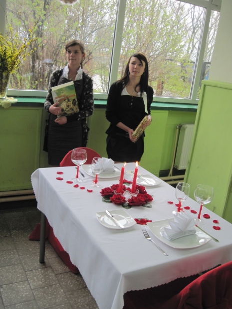(...) „Romantyczne inspiracje na stole”. Uczniowie mieli możliwość sprawdzenia własnych pomysłów na stylizację stołu oraz utrwalenia wiedzy i umiejętności przed egzaminami zewnętrznymi. Zadaniem uczestników konkursu było nakrycie stołu dla dwóch osób oraz wykonanie jego dekoracji, zgodnie z tematem. Ocenie podlegały następujące elementy: dobór bielizny stołowej, poprawność ułożenia zastawy stołowej i sztućców, dobór elementów dekoracyjnych, pomysłowość, aranżacja i estetyka stołu. Laureatkami konkursu zostały: Justyna Komenda i Anna Kancerz, obydwie z klasy II - technik hotelarstwa. Drugie miejsce przypadło Karolinie Gołuszka i Magdalenie Wiśniewskiej z klasy I - technik organizacji usług gastronomicznych. Trzecie miejsce zajęły: Joanna Lisiakiewicz i Maria Gądek. Wszyscy uczestnicy konkursu otrzymali dyplomy i nagrody książkowe.