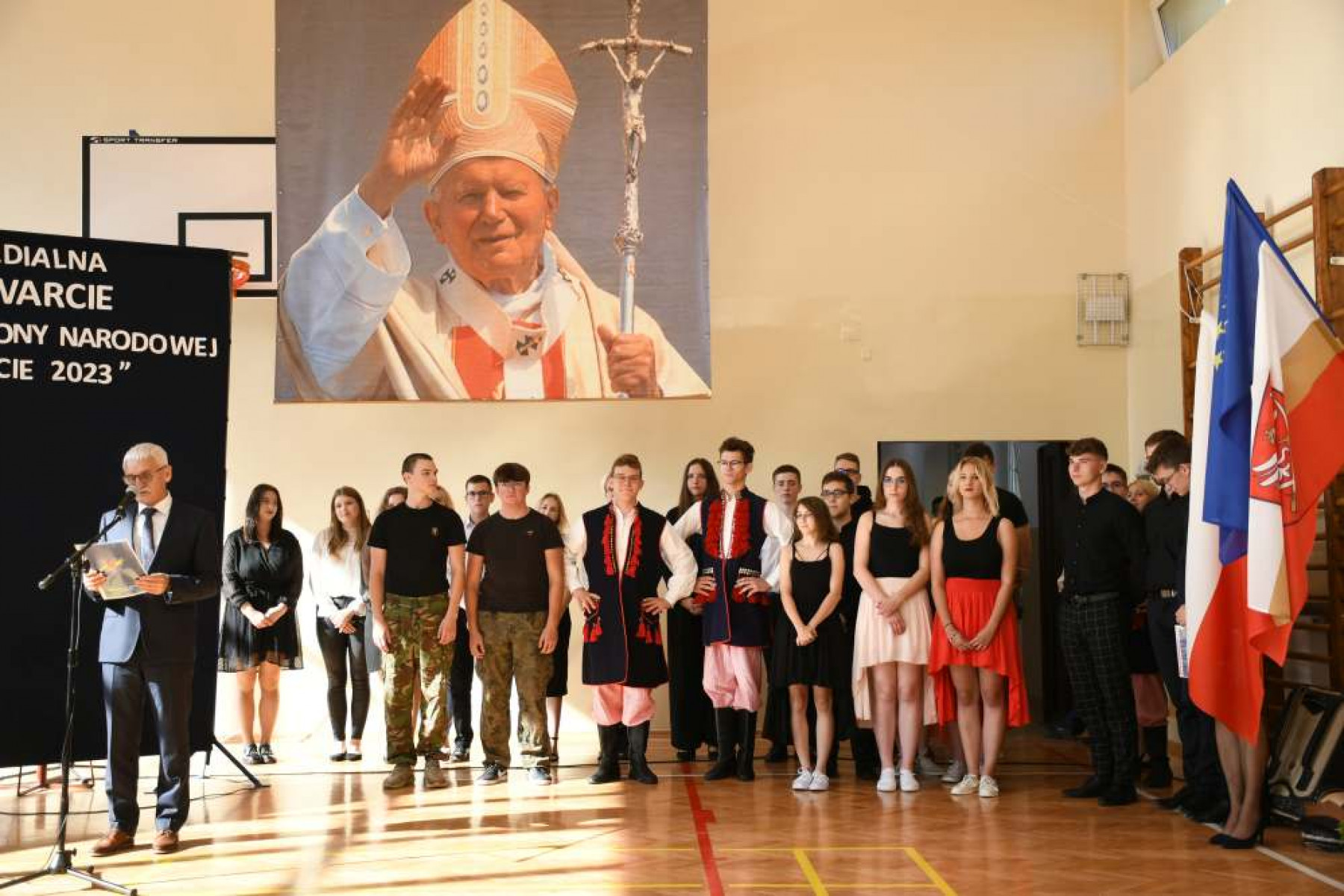 Zanim przecięto wstęgę i poświęcono obiekt, młodzież szkolna wystąpiła w części artystycznej, w której odtańczony został krakowiak, cha-cha, były pieśni patriotyczne, pokaz samoobrony, sztuki walki i wiele odniesień do umiłowanej Ojczyzny.