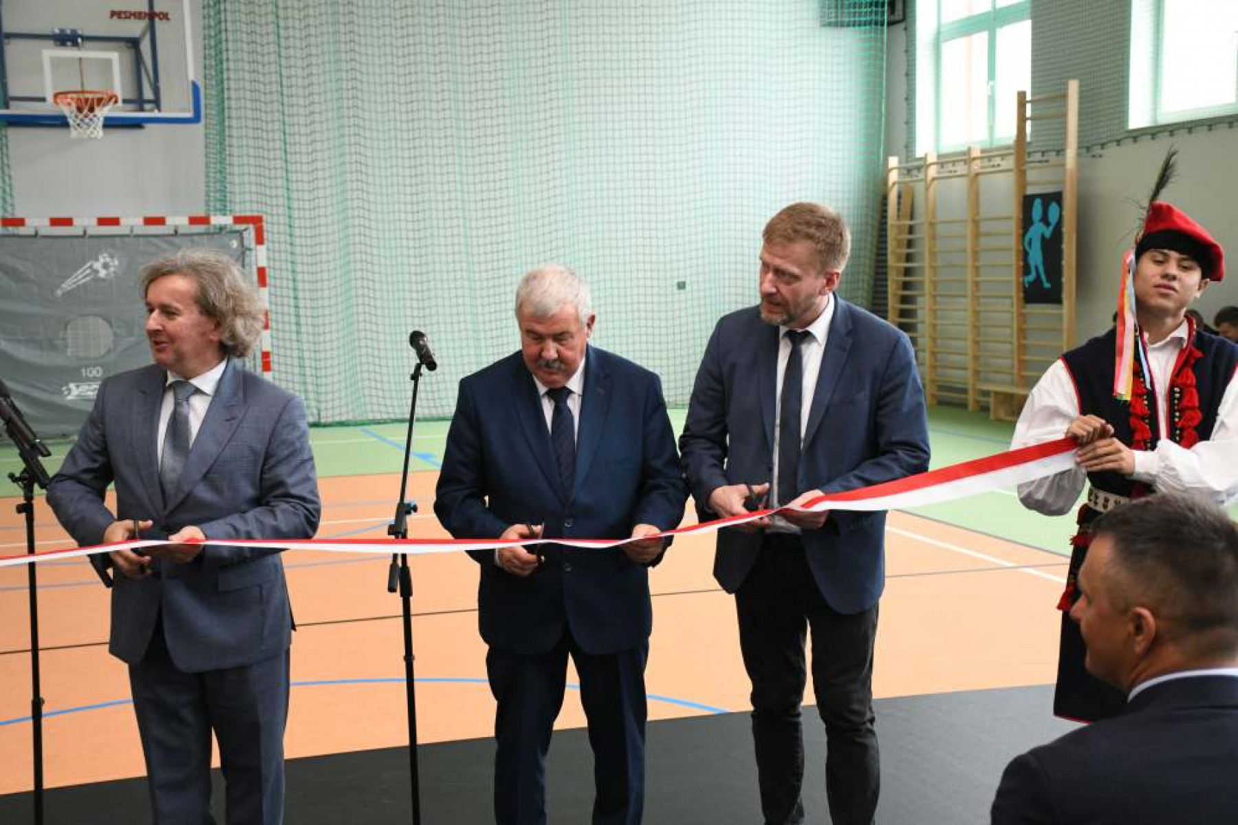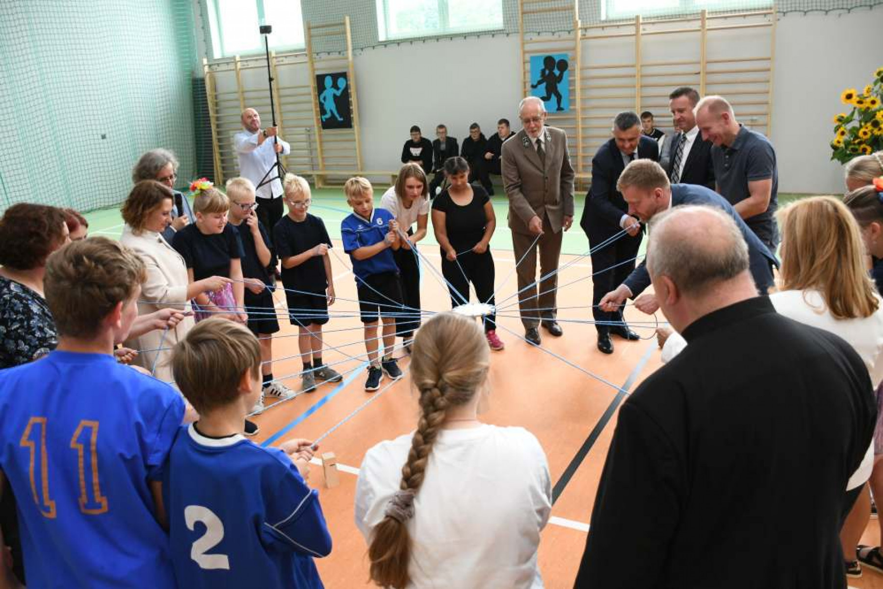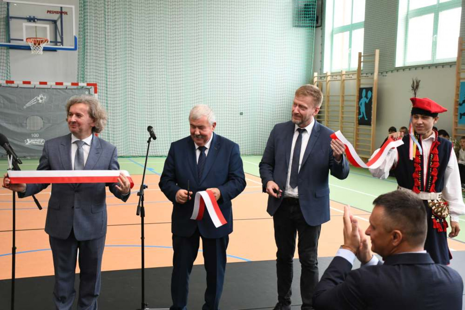 Przecięcie wstęgi otwierającej salę gimnastyczną w Zagorzycach