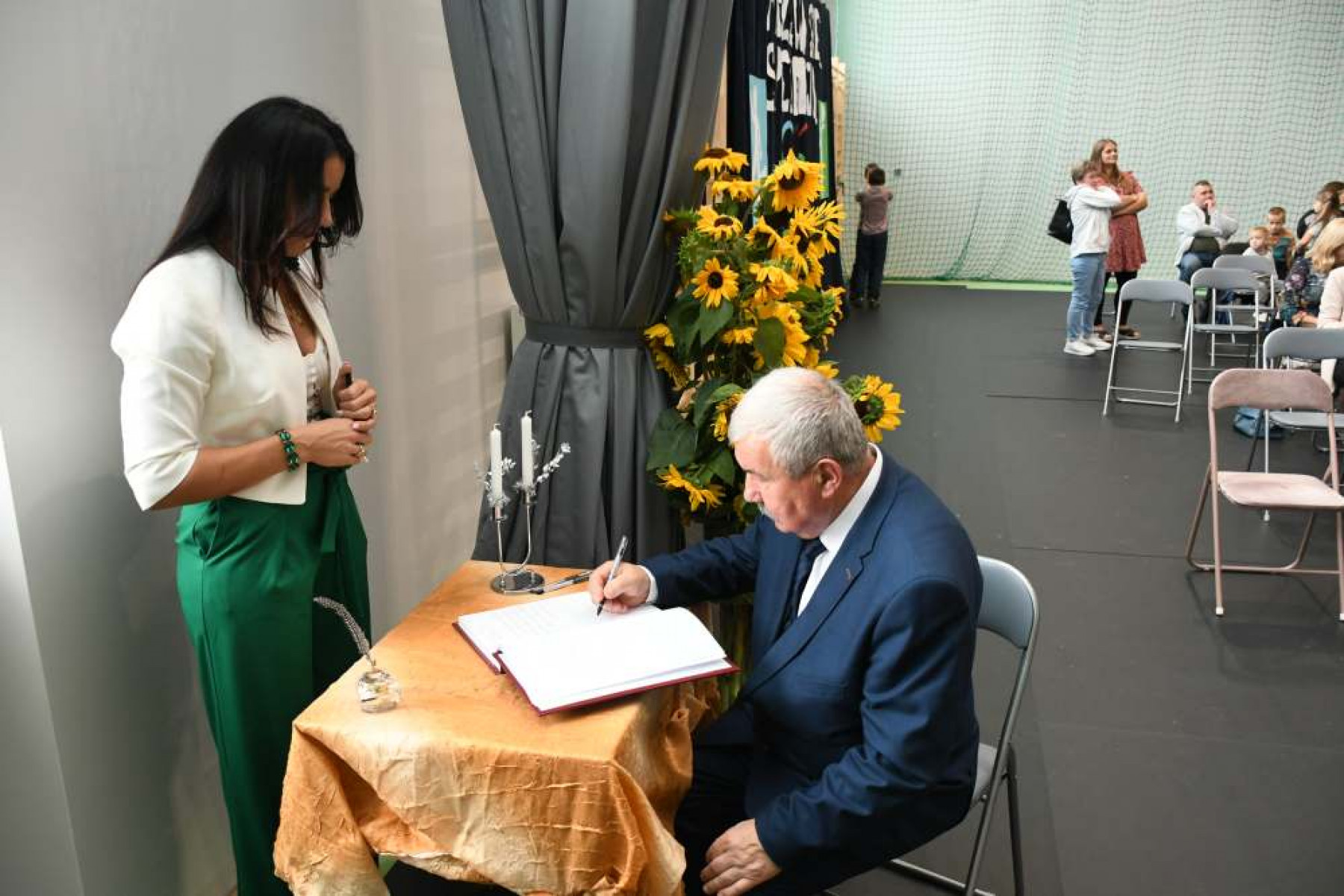 Starosta Jacek Kobyłka dokonuje wpisu do księgi pamiątkowej w Zagorzycach