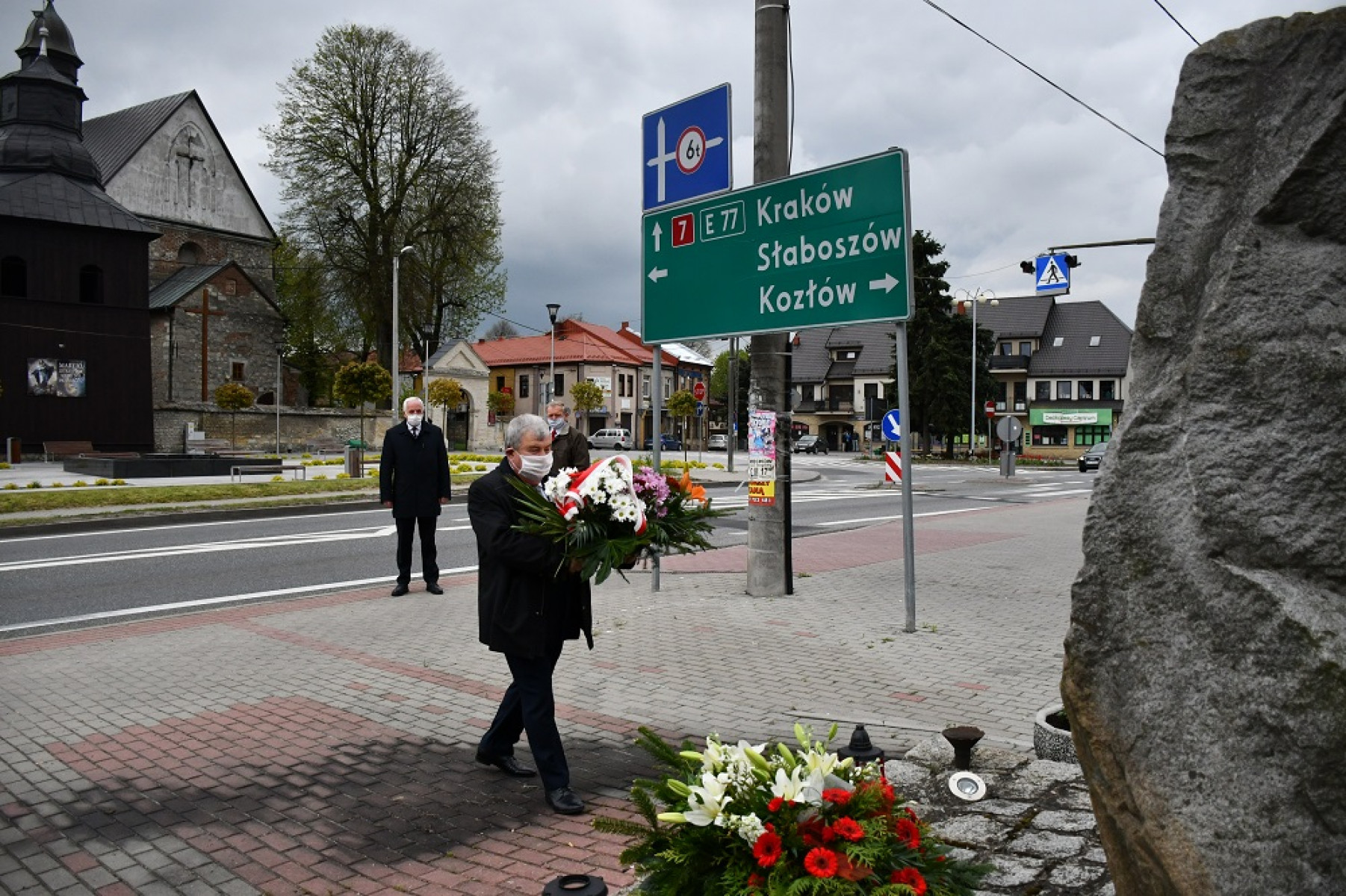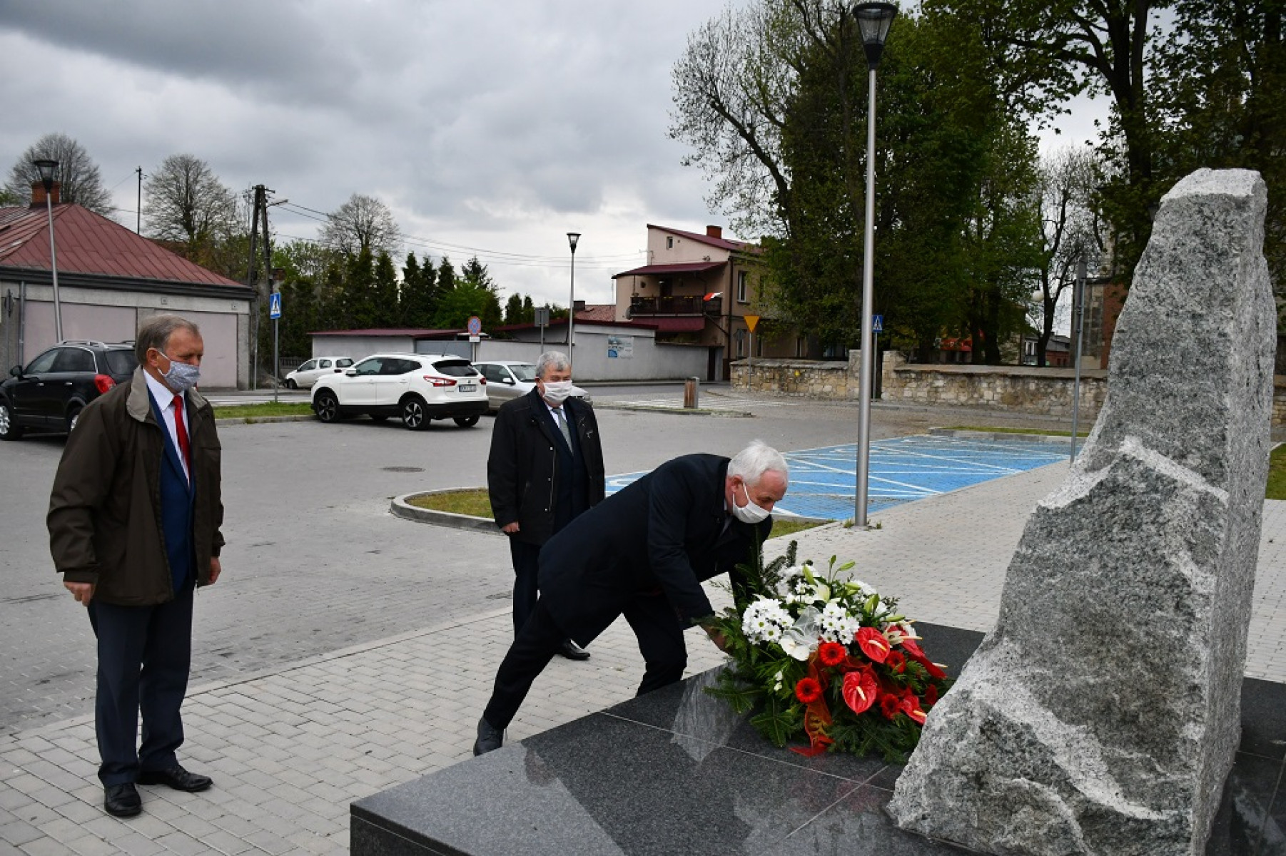 Przed uroczystościami miechowskimi, starosta z samorządowcami - Wójtem Markiem Szopą i Przewodniczącym Rady Gminy Henrykiem Humą uczcili 3 Maja składając wiązanki pod pomnikami w Książu Wielkim.