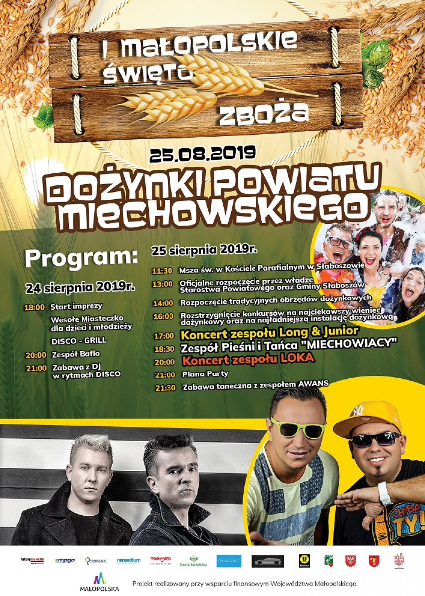 Zboża niemalże zniknęły już z pól nie tylko Miechowszczyzny, ale i Małopolski. Zwiastuje to czas świętowania i dziękczynienia za tegoroczne plony. Tegoroczne XIX Dożynki Powiatu Miechowskiego będą wyjątkowe, bowiem będą one jednocześnie świętem rolników z całego regionu. Po raz pierwszy w historii odbędzie się I Małopolskie Święto Zboża. To wszystko będzie się działo już w niedzielę 25 sierpnia na stadionie w Słaboszowie.