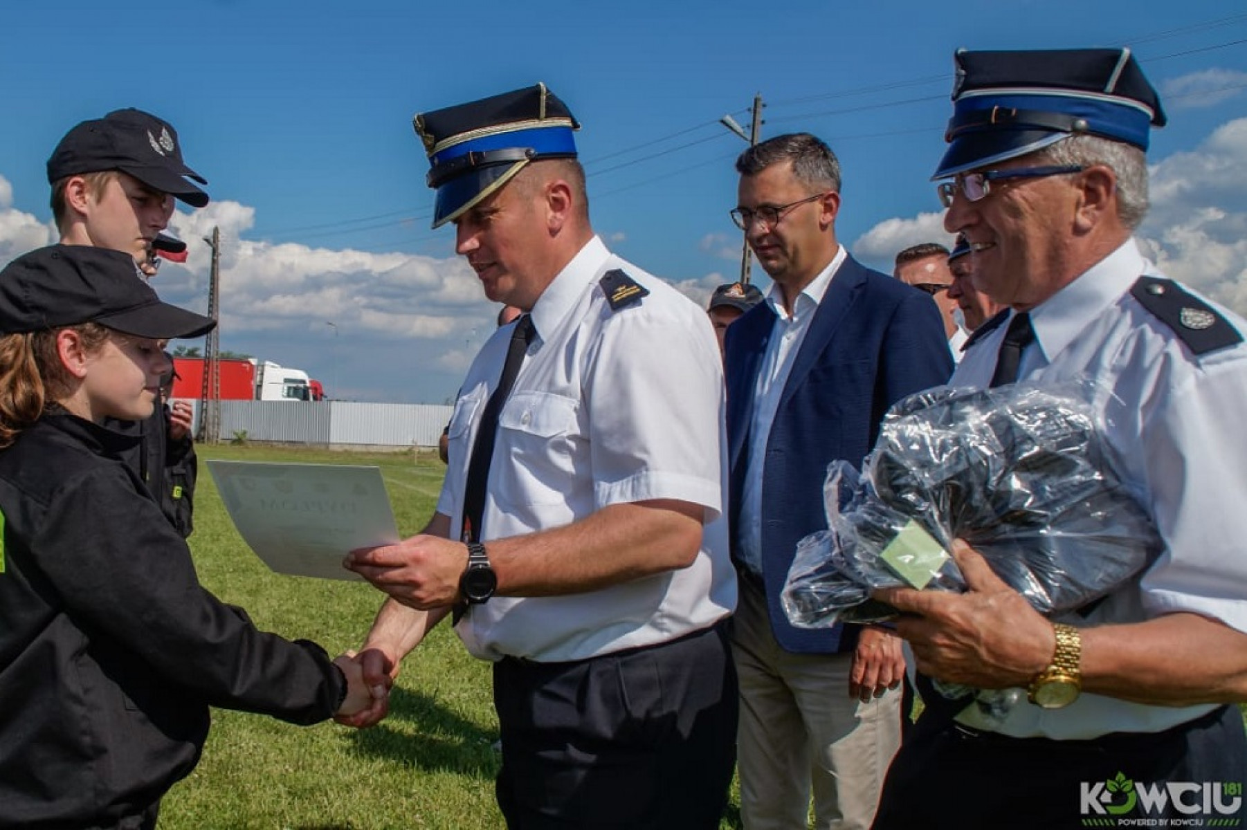 Komendant KP PSP mł. bryg. Michał Majda wręcza dyplom na Powiatowych Zawodach MDP w Bukowskiej Woli
