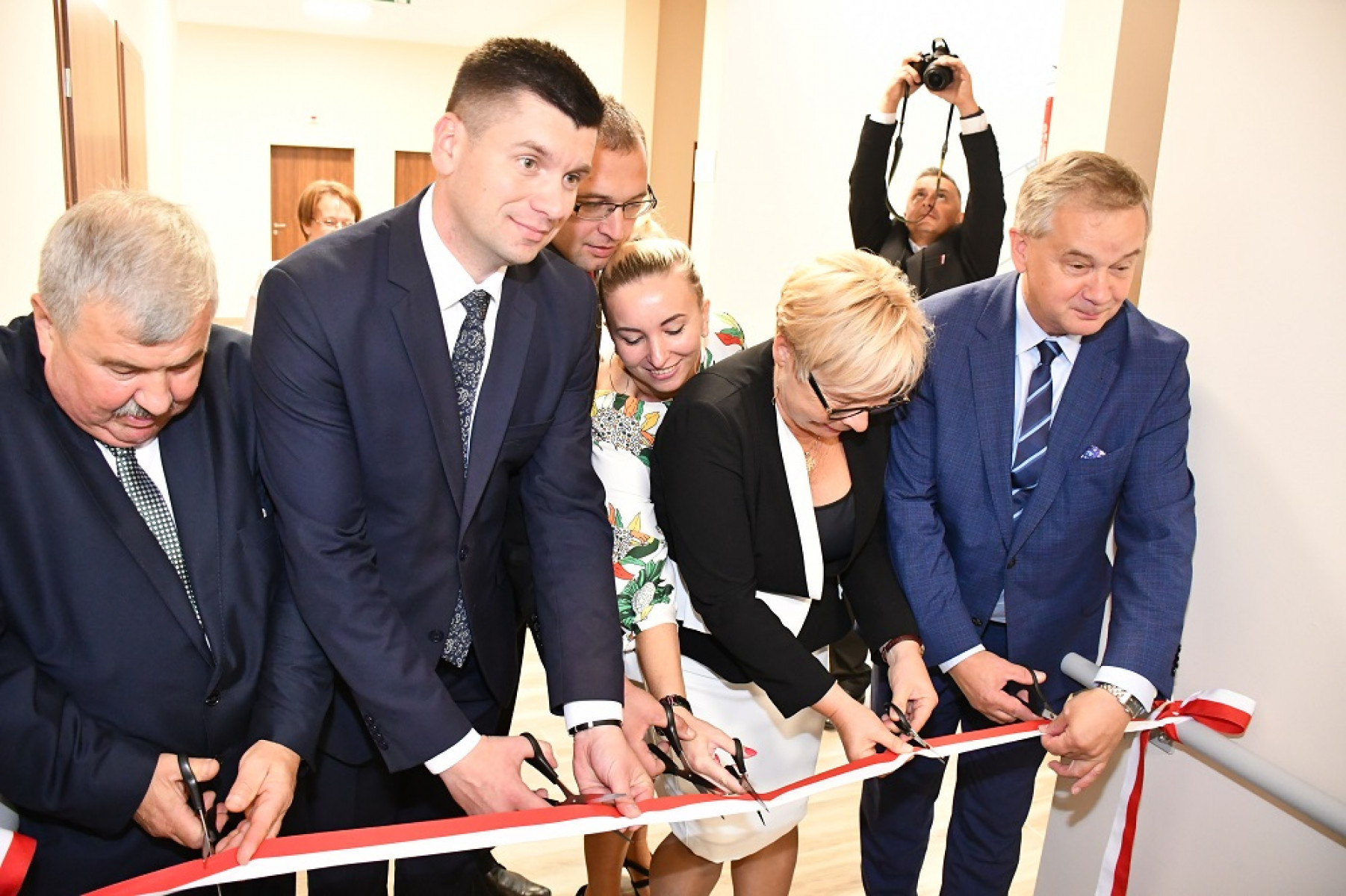 Symbolicznego otwarcia dokonali: wicemarszałek Łukasz Smółka, starosta Jacek Kobyłka, przewodniczący Rady Powiatu Krzysztof Świerczek, dyr. DPS Małgorzata Wachacka