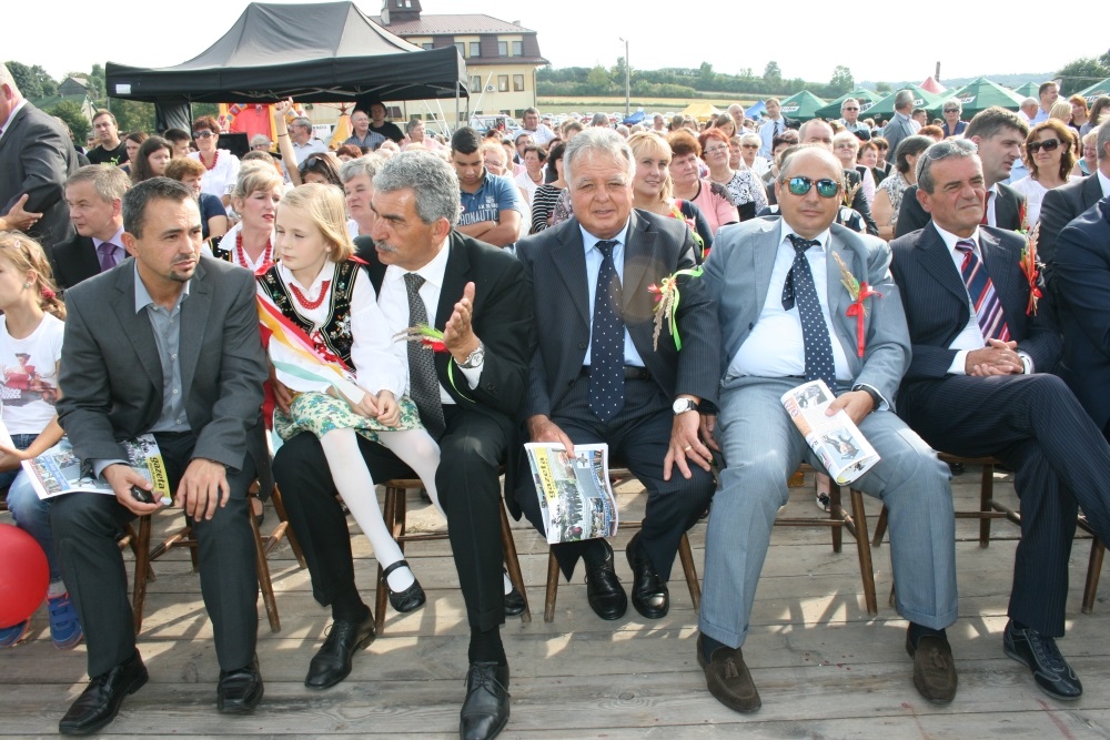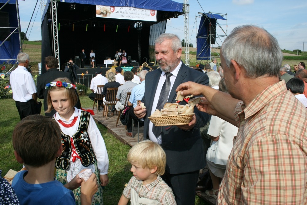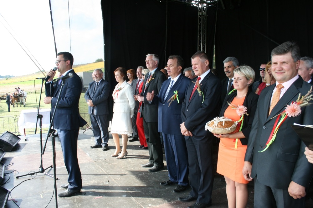 Na miejscu imprezy, na stadionie przy odnowionej remizie strażackiej gości i uczestników powitał burmistrz Gminy i Miasta Miechów Dariusz Marczewski. Z kolei starosta Marian Gamrat podziękował  rolnikom, gospodyniom, hodowcom i producentom rolnym ziemi miechowskiej za całoroczny trud i uzyskane plony. – By dzisiaj świętować i przypominać ludowe zwyczaje, a także bawić się, trzeba było najpierw wielu wyrzeczeń i pracy , aby zebrać plony. Na przeszkodzie stawała kapryśna pogoda i względy gospodarcze. Konieczna była determinacja, konsekwencja i pokora wobec natury. A jednak swoje zadanie jak co roku wykonaliście – mówił do rolników starosta. Ze słowami uznania i gratulacjami do miechowskich rolników zwrócili się goście: poseł Lidia Gądek, wicemarszałek województwa małopolskiego Wojciech Kozak i radny sejmiku wojewódzkiego Adam Domagała. Obecne były delegacje miast partnerskich. Na zaproszenia starosty przyjechali Włosi z XII Związku Krain Górskich ,,Monti Ernici” z siedzibą Veroli z regionu Lazio, zaś gośćmi burmistrza byli przedstawiciele miasta Wołoczyska z Ukrainy.  Na dożynkowej scenie obecni byli również radni powiatu  i miasta, dyrektorzy instytucji okołorolniczych z województwa i powiatu, szefowie służb mundurowych na czele zastępcą wojewódzkiego komendanta Policji w Krakowie insp. Jackiem Fabisiakiem
