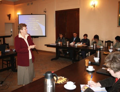 (...) szkół ponadgimnazjalnych i placówek oświatowych, domów pomocy społecznej, szpitala, Zarządu Dróg Powiatowych, Powiatowego Urzędu Pracy i Powiatowego Centrum Pomocy Rodzinie. Spotkanie otworzyła Maria Sztuk, Sekretarz Powiatu, uzasadniając potrzebę aktualizacji znajomości obowiązujących przepisów. Szkolenie prowadziła Stanisława Adamczyk z Krakowa, specjalista w zakresie zamówień publicznych, przygotowania i realizacji inwestycji. Przedmiotem szczegółowej analizy była nowelizacja przepisów przedmiotowej ustawy (Dz.U. Nr 171, poz. 1058 z 2008r.) obowiązującej od 24 września br. Prowadząca poświęciła odrębną część szkolenia problematyce prawa budowlanego. Zajęcia zakończyła dyskusja i pytania związane z ustawą Prawo zamówień publicznych.