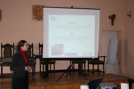 (...), które w swojej działalności zajmują się szeroko rozumianą opieką i pomocą społeczną. Szkolenie prowadziła przy wsparciu prezentacji multimedialnej Anna Pasieka z Fundacji Instytut Studiów Strategicznych w Krakowie. Uczestnicy spotkania otrzymali podstawowe wiadomości z zakresu ekonomii społecznej (polskie tradycje ekonomii społecznej, formy prawne, cele i kryteria) i form przedsiębiorczości społecznej (spółdzielnia socjalna, centrum integracji społecznej, zakład aktywności zawodowej, organizacja pozarządowa). Ciekawą częścią szkolenia były przykłady współpracy podmiotów lokalnych, mających na celu przeciwdziałanie wykluczeniu społecznemu. Nie zabrakło cennych informacji o perspektywach finansowana podmiotów ekonomii społecznej ze środków publicznych. Prowadząca szkolenie wyraziła nadzieję, że wiodący emat ,,Ekonomia społeczna - nowe perspektywy przeciwdziałania wykluczeniu społecznemu" zainspirowały reprezentantów miechowskiego środowiska do nowego spojrzenia na politykę społeczną.