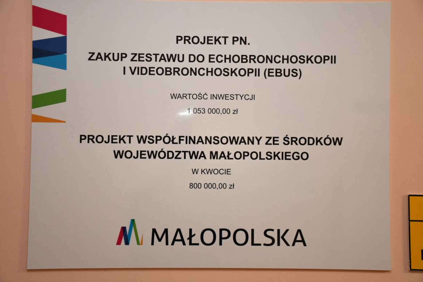 Zakup zestawu EBUS kosztował 1 053 000 zł. Dofinansowanie przekazane przez Urząd Marszałkowski stanowiło kwotę 800 000 zł, pozostałą cześć,w tym koszty remontu, szpital pokrył ze środków własnych.
