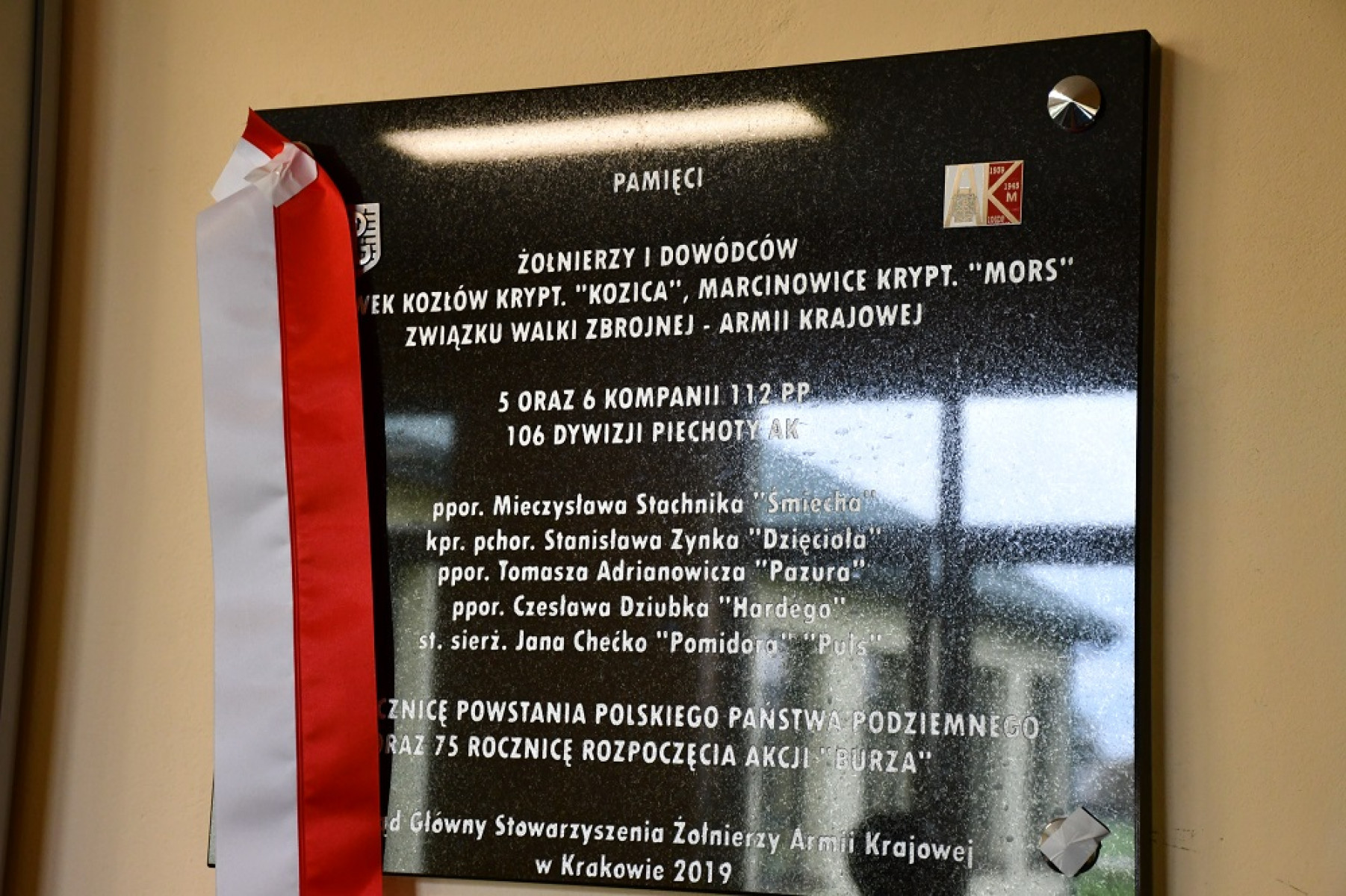 W 80. rocznicę powstania polskiego państwa podziemnego oraz w 75. rocznicę rozpoczęcia akcji „Burza”, w piątek 4 października 2019 r. w Szkole Podstawowej w Kozłowie uroczyście odsłonięto tablicę pamięci żołnierzy i dowódców placówek: Kozłów krypt. „Kozica”, Marcinowice” krypt. „Mors” Związku Walki Zbrojnej - Armii Krajowej 5 oraz 6 Kompanii 112 PP 106 Dywizji Piechoty AK. Na tablicy wyryto nazwiska najbardziej zasłużonych w działania konspiracyjne AK na kozłowskiej ziemi. Są to: ppor. Mieczysław Stachnik „Śmiech”, kpr. pchor. Stanisław Zynek „Dzięcioł”, ppor. Tomasz Adrianowicz „Pazur”, ppor. Czesław Dziubek „”Hardy”, st. sierż. Jan Chećko „Pomidor”, „Puls”.