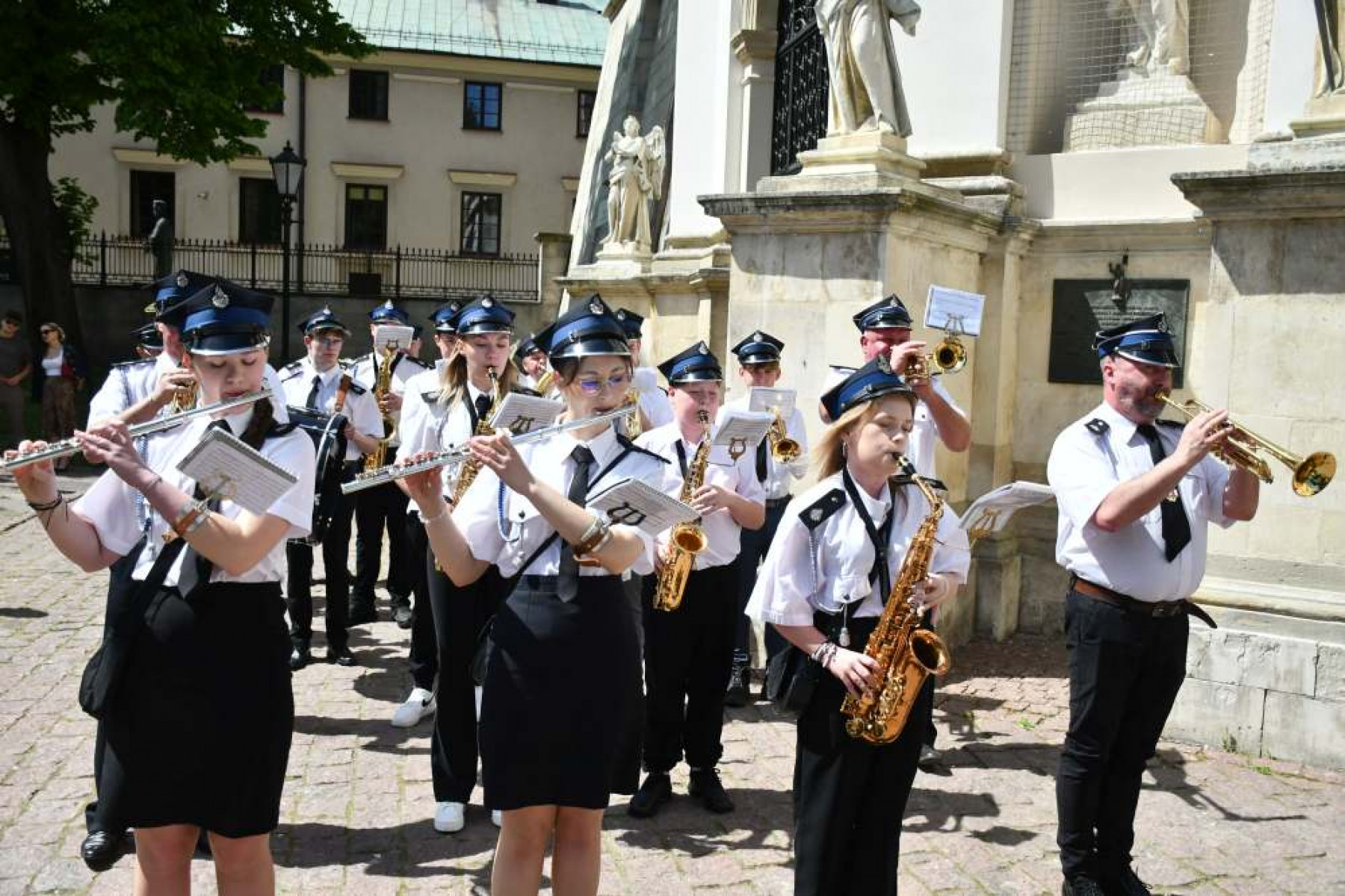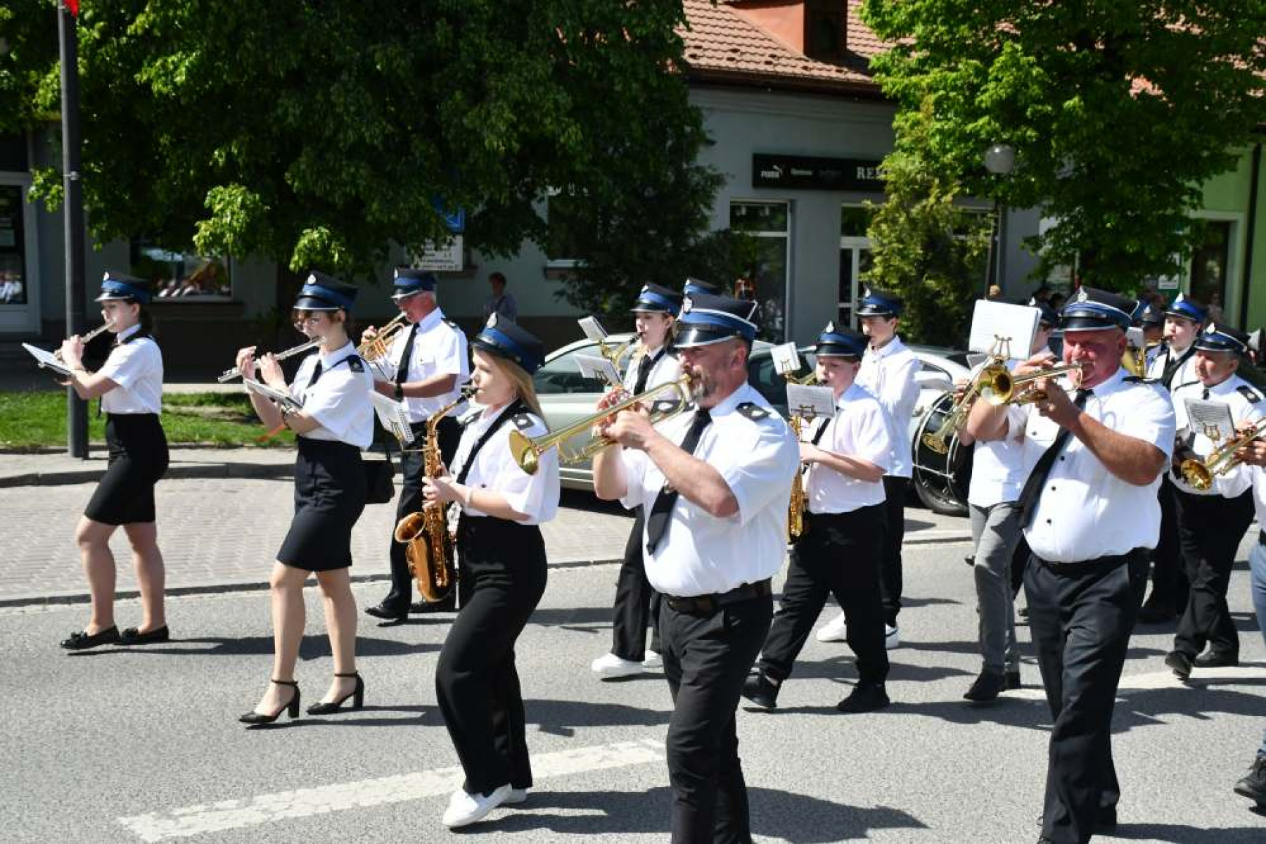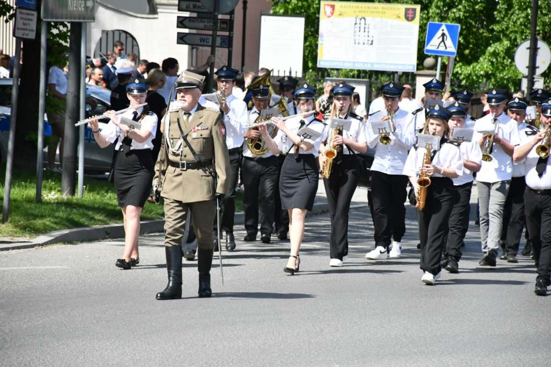 Miechowskie Święto Uchwalenia Konstytucji 3 Maja - orkiestry dęte ze Sławic i Nasiechowic prowadzą uczestników uroczystości