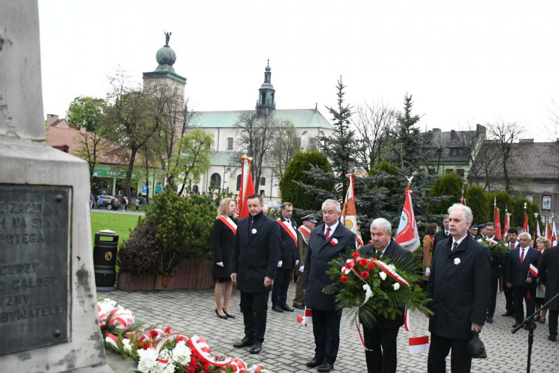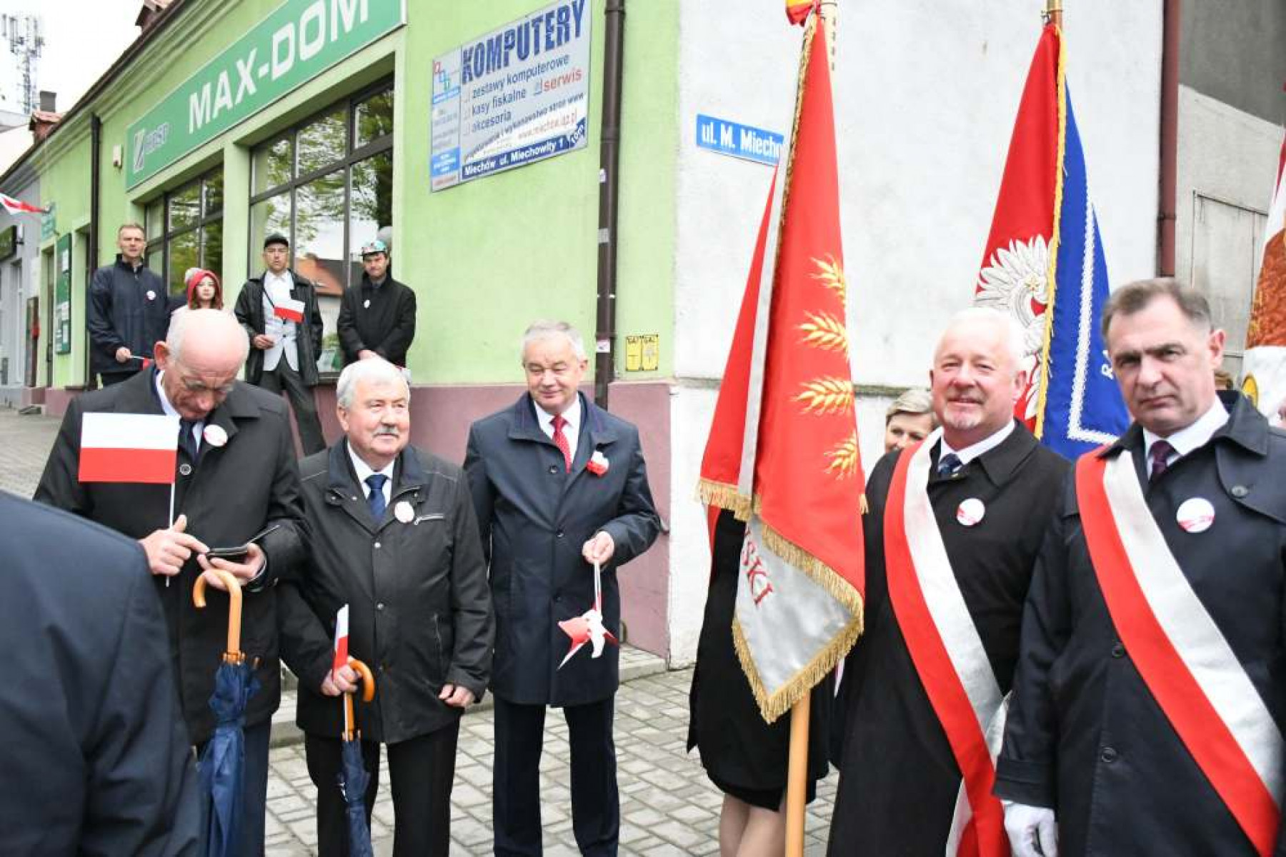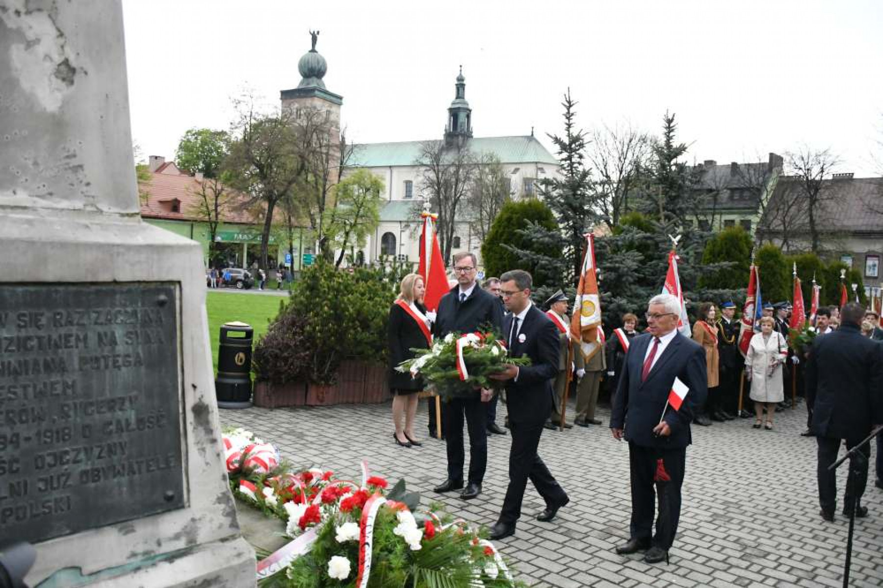 W oprawie orkiestr dętych ze Sławic i Nasiechowic, prowadzone przez wicedyr. „Ekonomika” Władysława Mastrzykowskiego poczty sztandarowe, samorządowcy, dyrektorzy przedszkoli i szkół, młodzież i dzieci przemaszerowały wkoło Rynku, by po podniesieniu flagi państwowej i odegraniu hymnu złożyć wiązanki kwiatów pod pomnikiem „Z Orłem”. Delegację Powiatu Miechowskiego reprezentowali: Starostowie Jacek Kobyłka, Paweł Osikowski, Piotr Grządziel z Zarządu Powiatu oraz Przewodniczący Rady Krzysztof Świerczek. Tę część uroczystości zakończyła „Rota”.