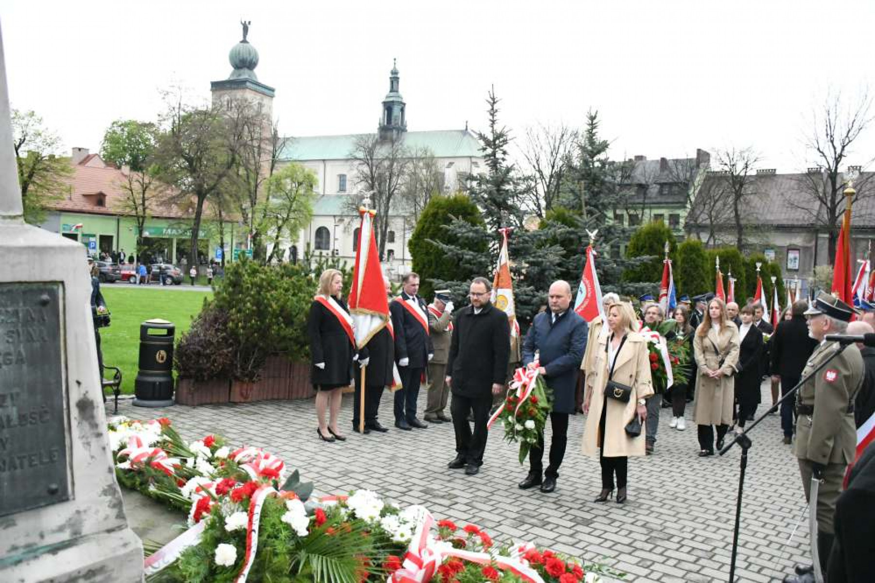 3 Maja 2023 w Miechowie - władze Powiatu Miechowskiego składają kwiaty pod Pomnikiem z Orłem