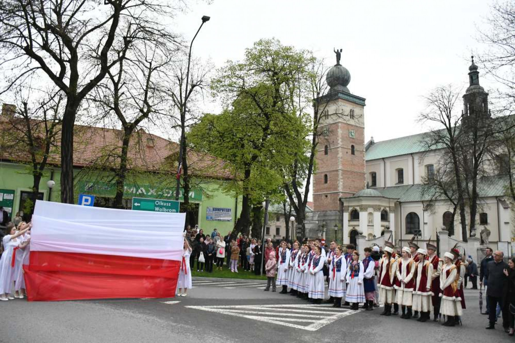 Choć pogoda nie w pełni dopisała podczas powiatowo-miejskich obchodów 232. rocznicy uchwalenia Konstytucji 3 Maja, za to dopisała liczba uczestników majowego świętowania. Wiszący do ostatniej chwili w powietrzu deszcz rozgoniły barwne stroje, w które ubrana była młodzież Zespołów Szkół - „Jedynki” i „Dwójki”, która pięknymi tańcami uświetniła uroczystości na miechowskim Rynku. Obchody ubarwiły również okolicznościowe atrybuty biało-czerwone - chorągiewki, flagi i przypinki ufundowane przez Powiat Miechowski.