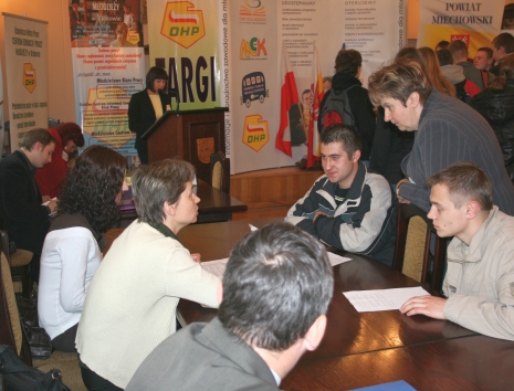 (...) Ochotnicze Hufce Pracy - Centrum Edukacji i Pracy Młodzieży w Krakowie i administrację powiatową. Celem targów, które otworzył starosta Mieczysław Bertek była prezentacja propozycji edukacyjnych i szkoleniowych oraz ofert pracy. W wystąpieniach Krystyny Rozłonkowskiej, dyrektor CEiP i Andrzeja Markiewicza, wicekuratora małopolskiego podkreślono promocyjny charakter spotkania i aktywność powiatu miechowskiego w tworzeniu szerokiej oferty pracy dla młodych ludzi. W otwarciu targów uczestniczyły władze powiatu, samorządowcy, osoby związane z lokalnym rynkiem pracy, pedagodzy, dziennikarze. Nie zabrakło najbardziej zainteresowanych - uczniów, absolwentów szkół i studentów, którzy orientacyjnie rozeznawali propozycje pracy lub po ukończeniu nauki pilnie poszukują zatrudnienia. Uczestnikami miechowskich targów były także osoby w średnim wieku. A było w czym wybierać. Swoje stoiska i materiały informacyjne zaprezentowało 15 firm z Krakowa, Kielc, Miechowa i powiatu miechowskiego. Wśród ofert pojawiły się propozycje pracy w zawodach umysłowych, fizycznych i specjalistycznych zarówno w kraju jak i zagranicą. Przedstawiciele firm i szkół udzielali wyczerpujących informacji o swoich ofertach. Oprócz pracodawców swoje miejsca na targach mieli m.in.: Mobilne Centrum Informacji Zawodowej w Krakowie, Komenda Powiatowa Policji i Powiatowy Urząd Pracy w Miechowie, Zespół Szkół im. W.Witosa w Książu Wielkim. W trakcie targów odbywały się krótkie instruktaże z doradcami zawodowymi ze specjalistycznych placówek z Krakowa. W organizację Targów Pracy aktywnie włączyło się Młodzieżowe Centrum Kariery w Miechowie, które zorganizowało w swojej siedzibie seminarium ,,Twoja kariera w twoich rękach" dla młodzieży i nauczycieli. Zajęcia warsztatowe ,,Kim chcę być? Poznajemy swoje predyspozycje zawodowe" poprowadziła Magdalena Kustosz, doradca zawodowy miechowskiego centrum. Jak zapowiedzieli organizatorzy, Targi Pracy w Miechowie będą miały charakter cykliczny.