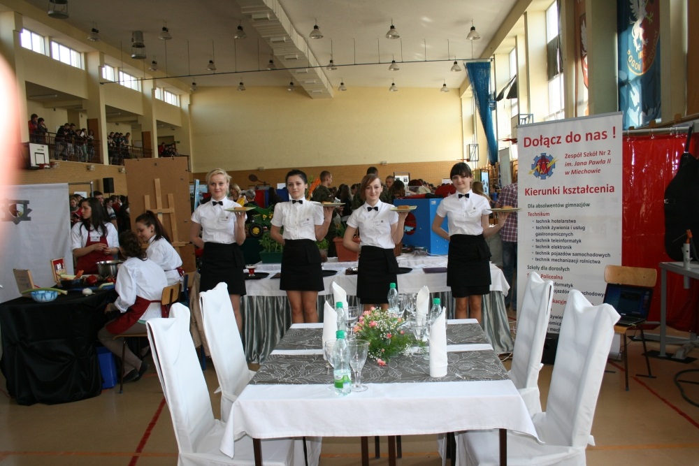 29 Kwietnia 2013(...) Odbiorcami bogatej prezentacji byli gimnazjaliÅ›ci koÅ„czÄ…cy w tym roku szkolnym naukÄ™. Organizatorem targów byÅ‚ WydziaÅ‚ OÅ›wiaty, Kultury i Sportu, zaÅ› inicjatorem Starosta Miechowski. Otwarcia szkolnej imprezy w Gimnazjum Nr 1 w Miechowie dokonali: naczelnik wydziaÅ‚u Leonard Mazur, sekretarz powiatu Maria Sztuk i dyrektor gimnazjum Zofia Piechowicz. W zamierzeniu organizatorów targi miaÅ‚y uÅ‚atwić gimnazjalistom wybór nowej, Å›redniej szkoÅ‚y i umożliwić porównanie ofert nauki w jednym miejscu. Targi stanowiÅ‚y również nowość i alternatywÄ™ dla tzw. dni otwartych szkóÅ‚. W sali gimnastycznej gimnazjum byÅ‚o ruchliwie, gÅ‚oÅ›no i kolorowo.Cztery szkoÅ‚y ponadgimnazjalne – Liceum OgólnoksztaÅ‚cÄ…ce, ZespóÅ‚ SzkóÅ‚ Nr 1, ZespóÅ‚ SzkóÅ‚ Nr 2 w Miechowie i ZespóÅ‚ SzkóÅ‚ z Książa Wielkiego, w atrakcyjnej, niekonwencjonalnej formie zaprezentowaÅ‚y wÅ‚asne kierunki i profile nauczania. Co można byÅ‚o zobaczyć i usÅ‚yszeć na stoiskach promocyjnych? ByÅ‚y pokazy umiejÄ™tnoÅ›ci kelnerów i barmanów, chemików i elektroników, geodetów i fryzjerów. Klasa mundurowa popisywaÅ‚a siÄ™ musztrÄ… wojskowÄ… i sprawnoÅ›ciÄ… fizycznÄ…, byÅ‚y pokazy sztuk walki, przyszli projektanci zieleni tworzyli na żywo aranżacjÄ™ przyszkolnego parku, tworzono ozdoby kulinarne z owoców i jarzyn, bukiety kwiatów, przybliżano możliwoÅ›ci wykorzystania sprzÄ™tu elektronicznego poprzez gry edukacyjne, demonstrowano modele maszyn rolniczych i urzÄ…dzeÅ„ mechanicznych. Ofertom stoiskowym towarzyszyÅ‚y popisy taneczne, instrumentalne i wokalne. UzupeÅ‚nieniem zabawowej konwencji targów edukacyjnych byÅ‚y konkursy i zabawy. Na szkolnych stoiskach dostÄ™pne byÅ‚y ulotki zapraszajÄ…ce do wyboru poszczególnych szkóÅ‚. ZespoÅ‚y szkolne zadbaÅ‚y o oryginalne, humorystyczne stroje. Uczniom towarzyszyli dyrektorzy szkóÅ‚ i nauczyciele. – Fajny pomysÅ‚, wszystko w jednym miejscu i jest z czego wybierać – daÅ‚o siÄ™ sÅ‚yszeć wÅ›ród podekscytowanych gimnazjalistów. – Mam nadziejÄ™, że nasze targi edukacyjne zostaÅ‚y odebrane przez gimnazjalistów jako ciekawa propozycja uÅ‚atwienie wyboru nowej szkoÅ‚y. BÄ™dziemy starali siÄ™, by staÅ‚y siÄ™ one imprezÄ… cyklicznÄ… – podsumowaÅ‚ starosta Marian Gamrat.
