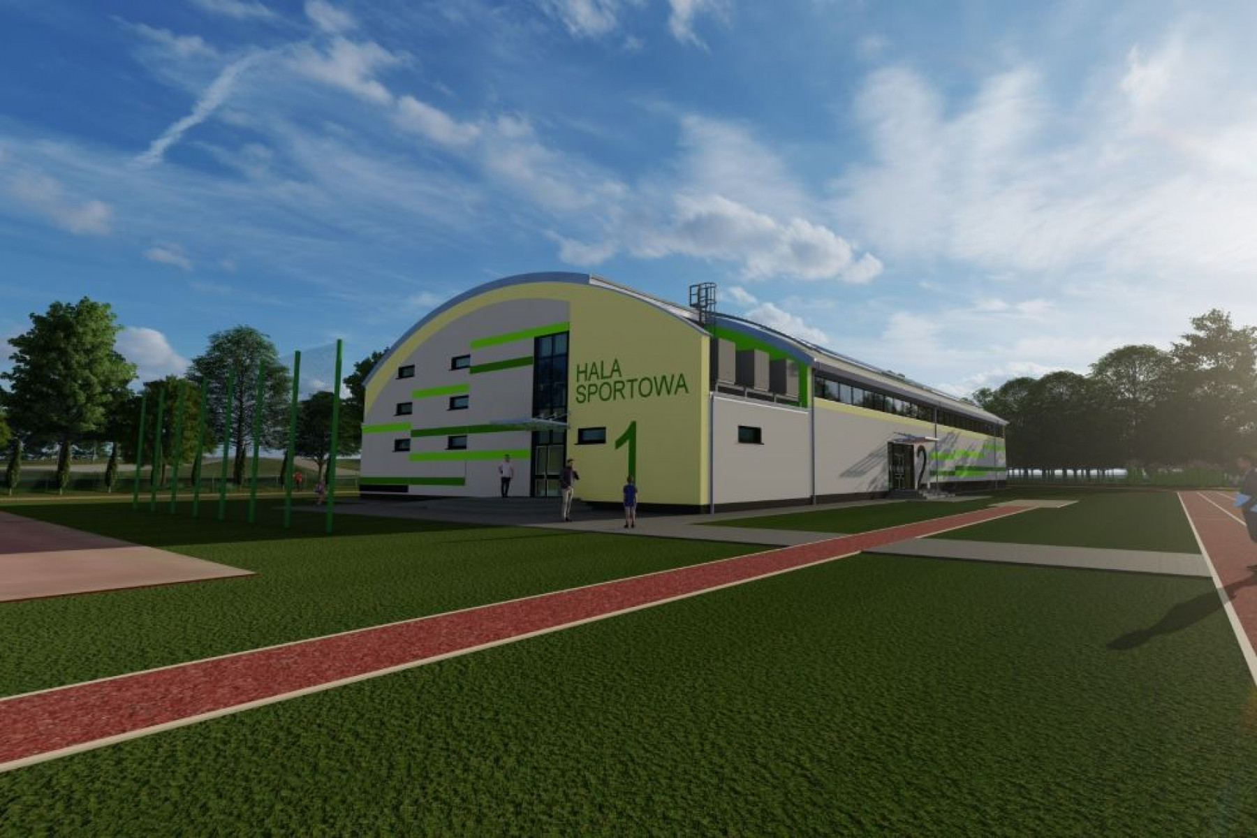 - Budowa budynku hali sportowej z dachem łukowym o konstrukcji lekkiej szkieletowej z dźwigarów z drewna klejonego, opartym w sposób przegubowy na słupach żelbetowych utwierdzonych w stopach fundamentowych oraz zaplecza socjalnego w konstrukcji tradycyjnej murowo żelbetowej.