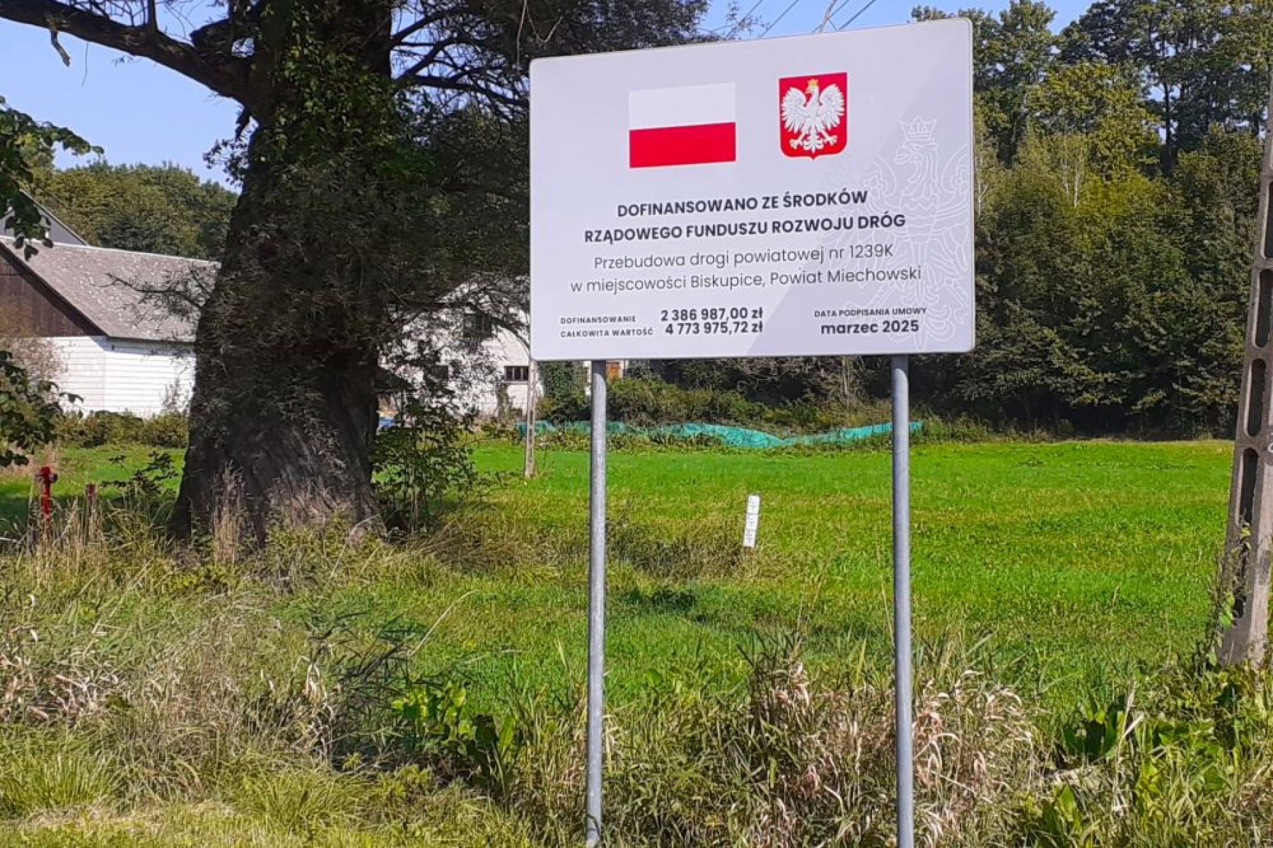 Trwa przebudowa drogi powiatowej w Biskupicach - tablica informacyjna