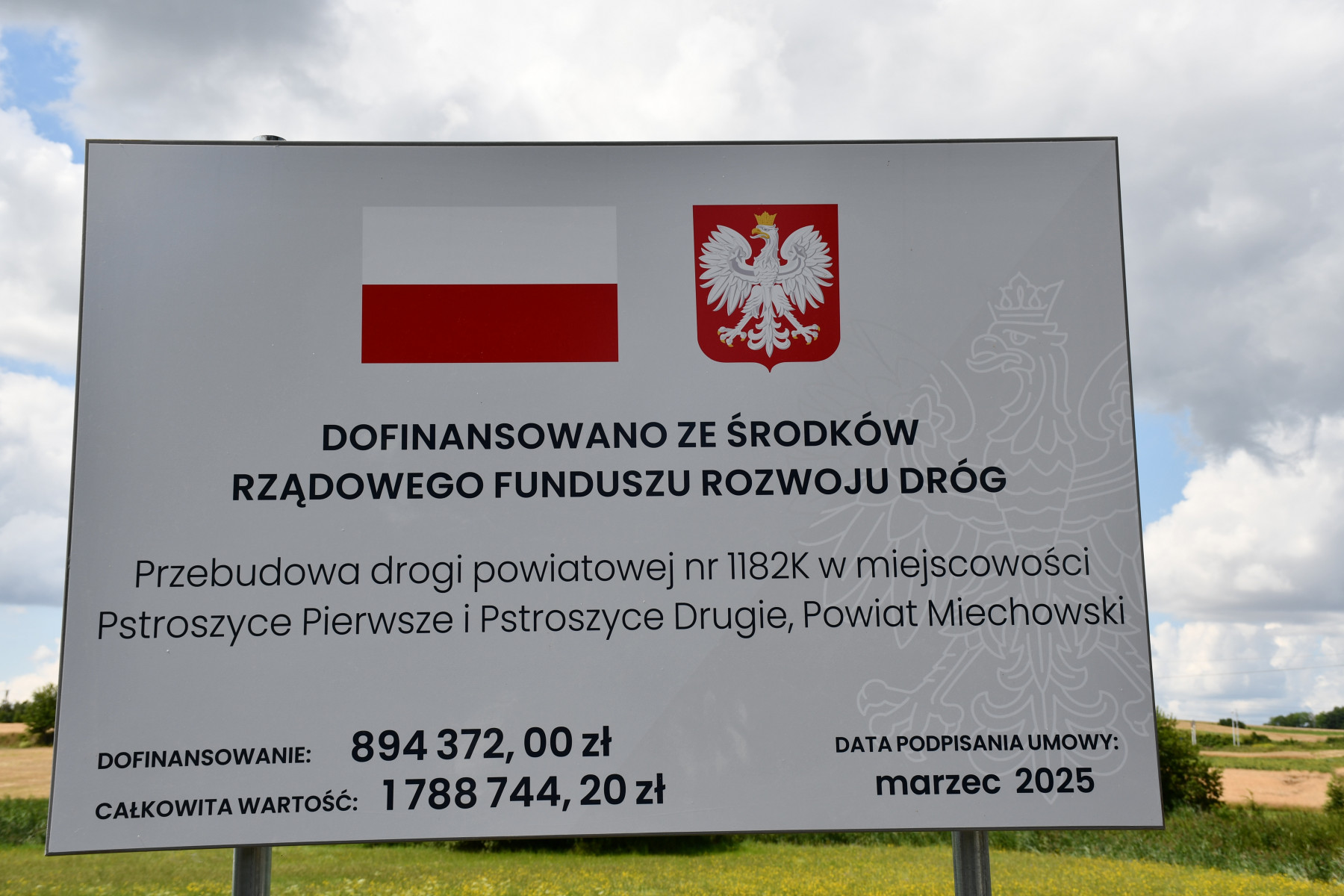 Przebudowa drogi powiatowej nr 1182K w km od 11+025 do km 11+825 w miejscowości Pstroszyce Pierwsze i Pstroszyce Drugie jest realizowana z dofinansowaniem pochodzącym ze środków Rządowego Funduszu Rozwoju Dróg.