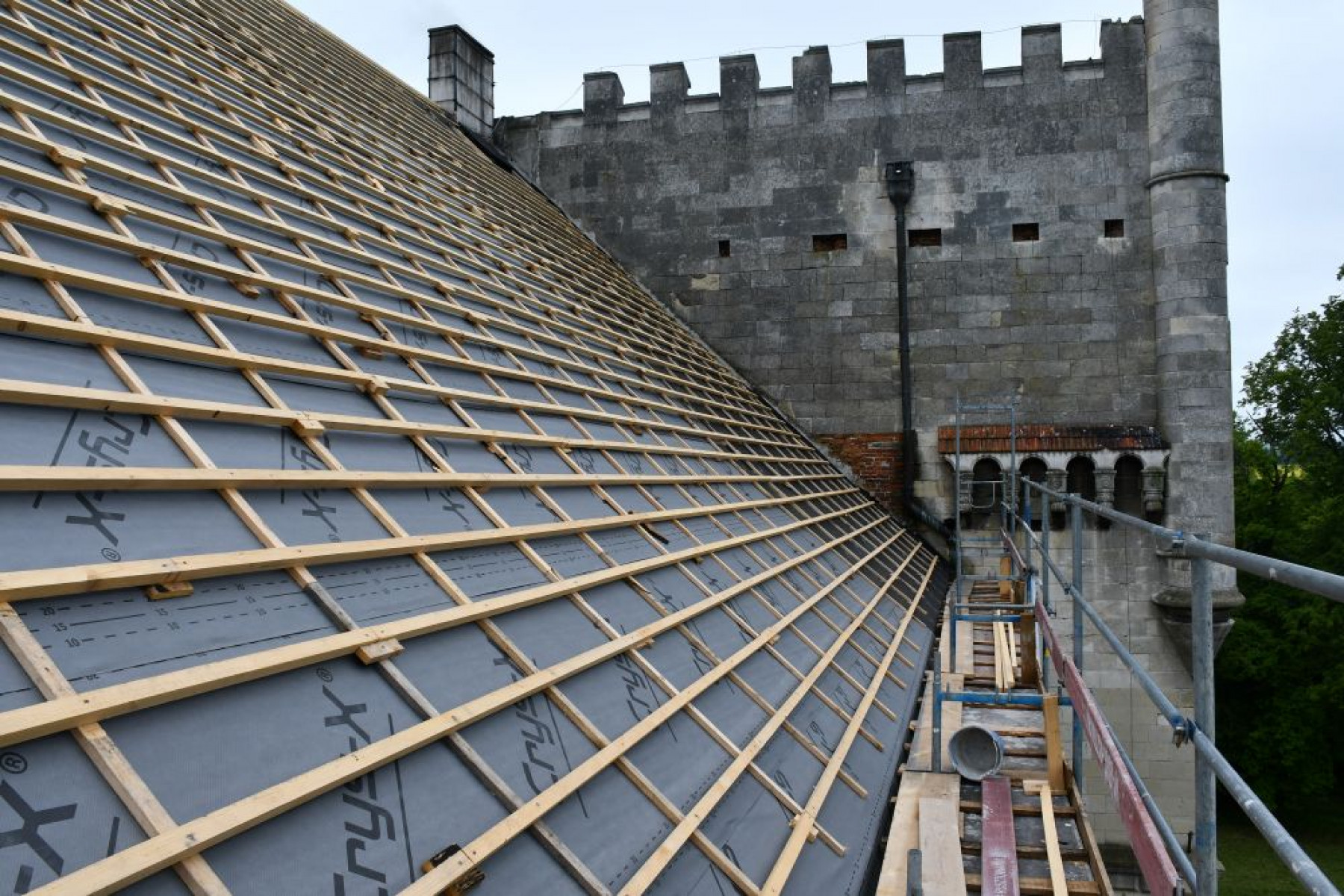 Równocześnie trwają prace związane z wymianą dachu na nowy, dzięki pozyskanemu dofinansowaniu z Rządowego Programu Odbudowy Zabytków Polski Ład. Uzyskana promesa wynosi 1 297 112,35 zł co stanowi 98% wartości inwestycji.