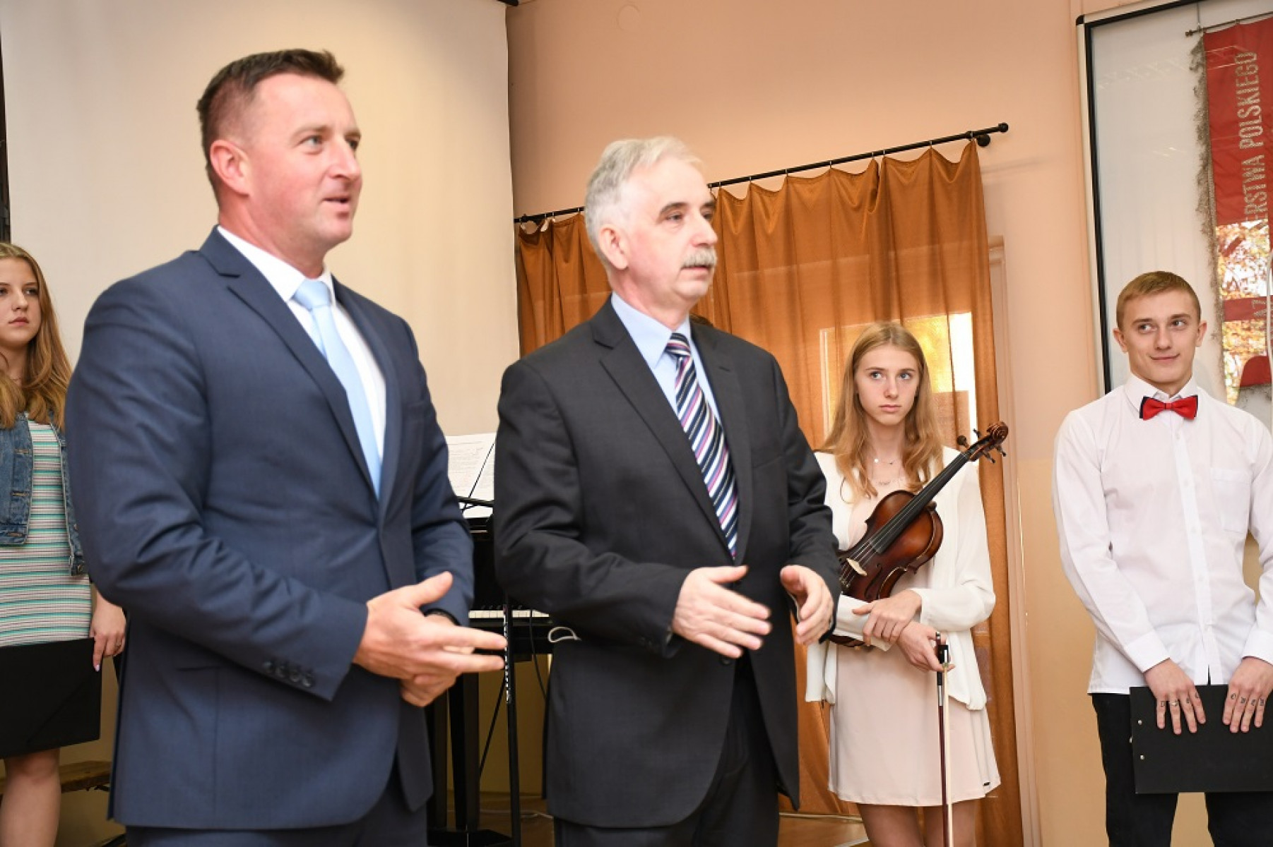 Piotr Grządziel, absolwent miechowskiego LO, gratulując nagrodzonym nauczycielom i pracownikom szkoły, podziękował im za wychowanie i kształcenie kolejnych pokoleń, za trud wkładany w proces kształcenia i za to, że w tym Liceum ciągle liczą się takie wartości jak tolerancja, zaufanie, szacunek. Życzył zadowolenia z pracy, wdzięczności uczniów, determinacji i przede wszystkim zdrowia.