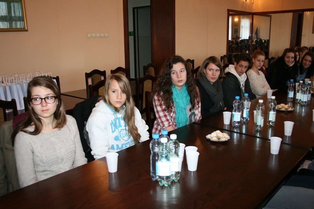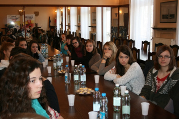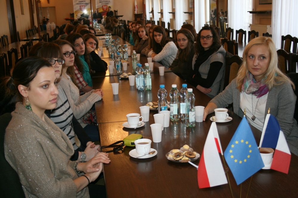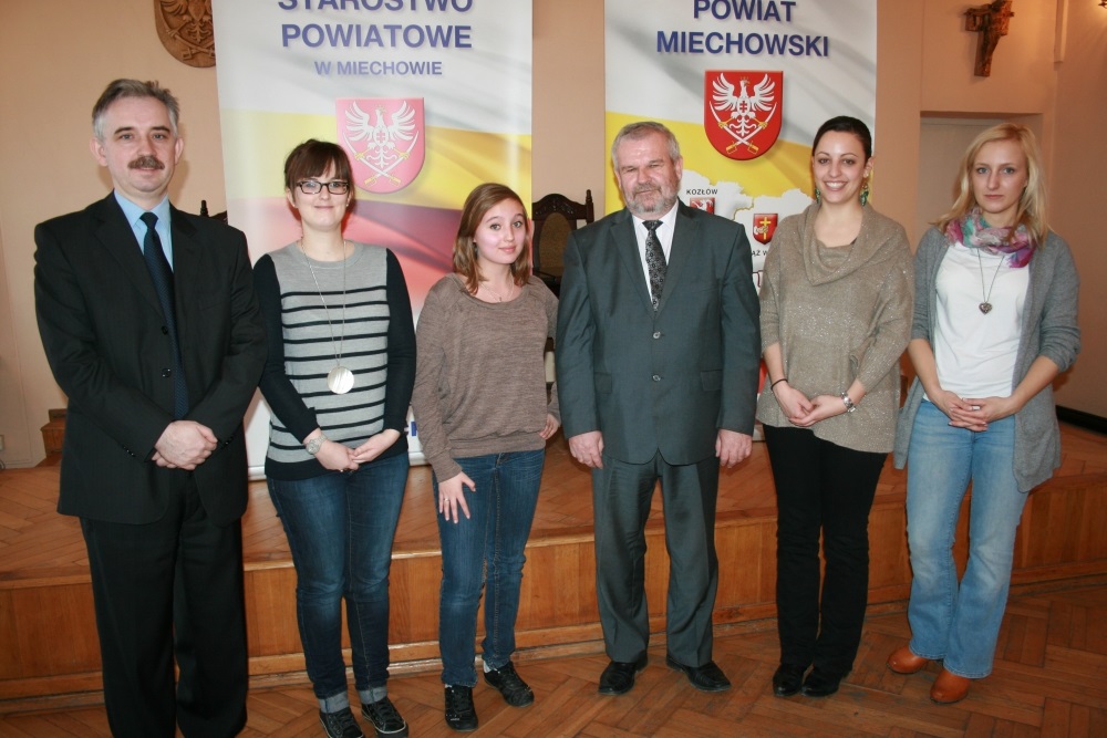 11 Kwietnia 2013(...) Jednym z punktów pobytu było spotkanie młodych Francuzów i ich opiekunów oraz uczniów miechowskiej szkoły ze starostą powiatu miechowskiego Marianem Gamratem. W budynku urzędu starosta powitał gości i wyraził zadowolenie z kontynuowania udanej współpracy pomiędzy szkołami. Goście wysłuchali informacji o lokalizacji, topografii i strukturze administracyjnej powiatu, jego głównych zadaniach, funkcjonowaniu szkolnictwa ponadgimnazjalnego, a także o roli samego starosty. Marian Gamrat nawiązał również do ćwierćfinałowego meczu Ligi Mistrzów, w którym Paris St. Germain uzyskał remis po dobrym spotkaniu na boisku ,,Barcy”. Rzecznik prasowy Ryszard Nasada zaprezentował młodzieży flagę i sztandar powiatu, wyjaśniając ich symbolikę. Z kolei nauczycielki z Longeron – Caroline Bourgeois i Marie Sergeant opowiedziały gospodarzom o swojej szkole. Liceum zlokalizowane jest w 2 tysięcznym miasteczku, w okolicach Nantes. Pobiera w nim naukę 400. uczniów. Szkoła prowadzi profile: techniczny, marketingowo – ekonomiczny, humanistyczny, informatyczny. W dyskusji dominowały tematy oświatowe dot. m.in. obu systemów edukacyjnych. Wśród francuskich uczniów obecna była sympatyczna Marie, która nawiązała do swoich polskich korzeni. Zespół Szkół Nr 1 reprezentowali romanista Piotr Grządziel, który służył nieocenioną pomocą lingwistyczną i anglistka Joanna Nowak. Plan pobytu Francuzów obejmuje zwiedzanie Oświęcimia, Krakowa, Zakopanego, spotkania z konsulem Republiki Francuskiej w Krakowie i Zarządem Województwa Małopolskiego. W Miechowie uczniowie z Longeron zwiedzą historyczny kompleks po Zakonie Bożogrobców i bazylikę Grobu Bożego (tzw. polską Jerozolimę), a także zapoznają się z Galerią BWA ,,U Jaksy” i organizowanym Muzeum Ziemi Miechowskiej. Goście starosty zostali obdarowani pakietami promocyjnymi powiatu, a międzynarodowe spotkanie zakończyła wspólna fotografia.