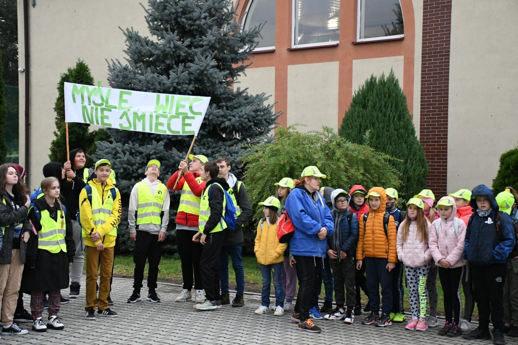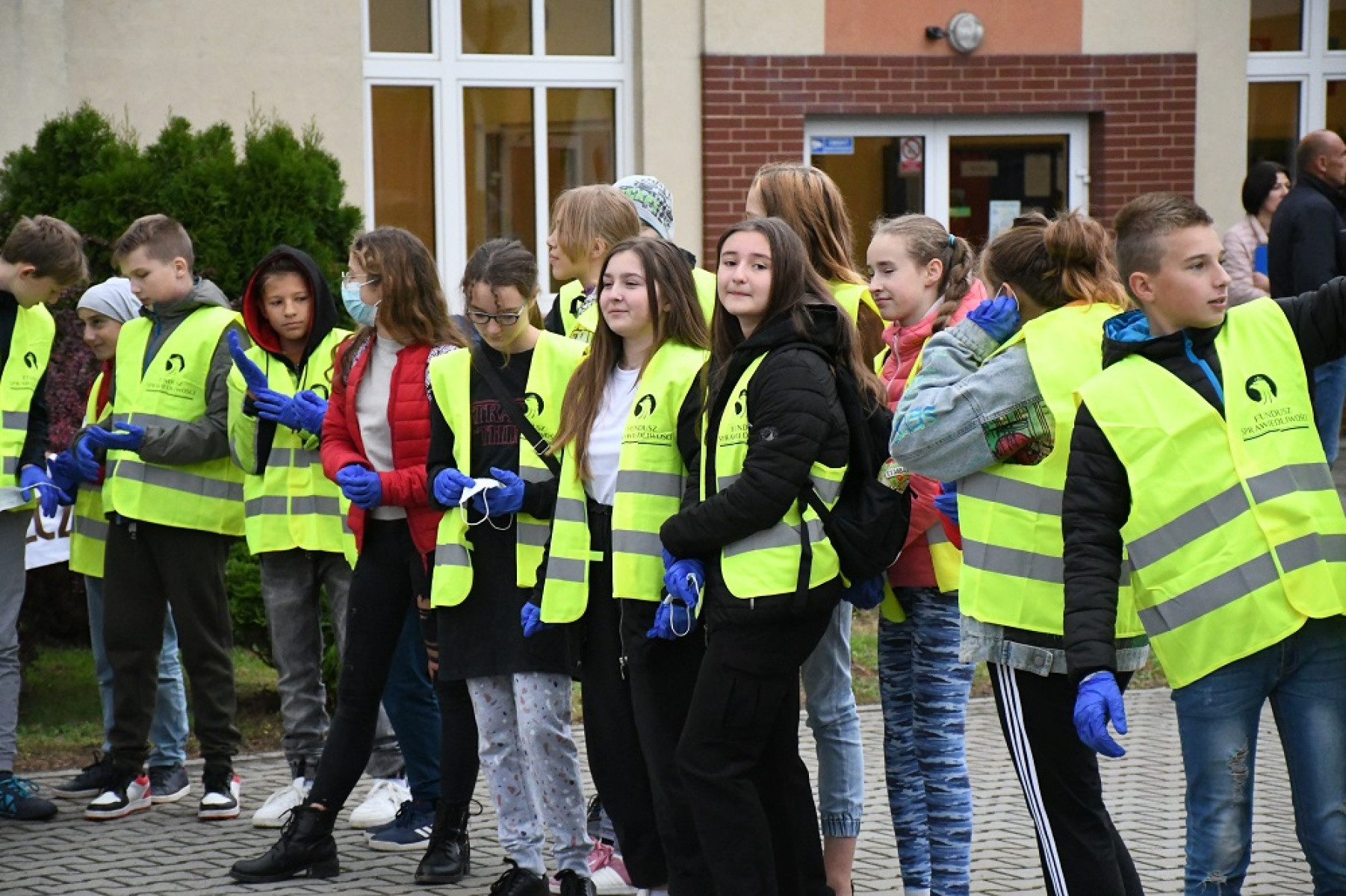 Uczniowie z Dziaduszyc z kamizelkami odblaskowymi i rękawicami gotowi do sprzątania zakątków gminy