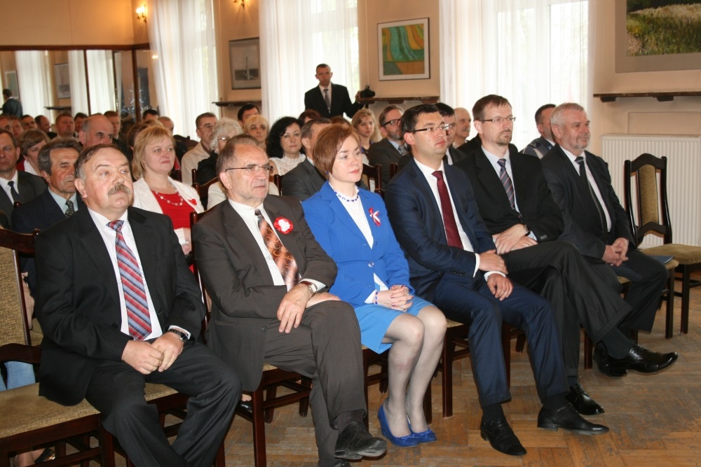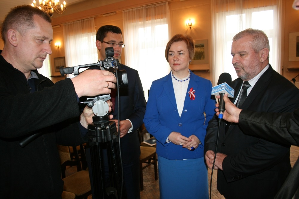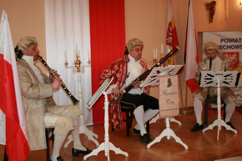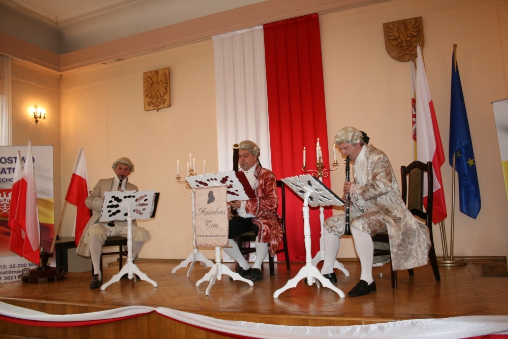 6 Maja 2013(...) W bazylice mszę św. celebrował ks. infułat Jerzy Gredka, proboszcz miechowskiej parafii. Homilię wygłosił ks. Zbigniew Grzesiński, nawiązując do dziejowej roli Pani Jasnogórskiej, Matki Narodu Polskiego. Goście, samorządowcy, dyrektorzy zakładów pracy, kombatanci, młodzież i harcerze złożyli pod historycznym pomnikiem z Orłem wieńce i kwiaty w asyście licznych pocztów sztandarowych. Parlamentarzystom towarzyszyły dzieci z miechowskich przedszkoli samorządowych nr 2 i 3. Hymn państwowy odegrała orkiestra dęta ,,Sygnał”, którą prowadził kapelmistrz Mirosław Czekaj. Ceremoniarzem uroczystości był asp. sztab. Mirosław Gręda. W budynku urzędu powiatowego starosta Marian Gamrat powitał gości, wśród których byli m.in. posłowie na Sejm RP – Lidia Gądek i Józef Lassota, gen.bryg. Jerzy Wójcik, b. dowódca 6. Brygady Powietrzno – Desantowej i burmistrz Miechowa Dariusz Marczewski, współorganizator uroczystości. Posłanka w swym wystąpieniu podkreśliła, że 3 – majowe święto jest radosnym wydarzeniem, a flaga polska, mimo tylko dwóch barw, białej i czerwonej, niesie głęboką symbolikę. – Konstytucja, której kolejną rocznicę świętujemy była wyraźnym dowodem usilnej dążności Polaków do własnego Państwa, demokratycznych i humanistycznych reguł funkcjonowania Narodu. Do dziś stanowi podstawę naszych legislacyjnych działań, wszak naród bez konstytucji, to jakby naród bez serca – powiedział starosta w okolicznościowym wystąpieniu. Odczytano list do uczestników spotkania od marszałka Województwa Małopolskiego Marka Sowy z życzeniami udanego świętowania. Następnie starosta wręczył po raz dziesiąty doroczną nagrodę ,,Przyjaciela powiatu”. W tym roku otrzymała ją Maria Słuszniak, dyrektor Powiatowej i Miejskiej Biblioteki Publicznej im. Marii Fihel w Miechowie za skuteczną i różnorodną działalność na rzecz upowszechniania i powiększania gromadzonego od 90 lat wielotematycznego księgozbioru. Także za aktywną promocję czytelnictwa i edukację czytelniczą, za pozyskiwanie funduszy unijnych i udaną partnerską współpracę z samorządami powiatu. Nagrodzona dziękując za dostrzeżenie przez starostę jej pracy zaznaczyła, że nagrodę (statuetkę z wyobrażeniem dzwonnicy bazyliki autorstwa miechowianki Elżbiety Kolarz) traktuje jako wyróżnienie dla wszystkich pracowników biblioteki. W części artystycznej wystąpił w strojach z epoki tercet kameralistów ,,Amadeus Trio” (fagot i dwa klarnety) z Bielska - Białej, który zaprezentował utwory czołowego przedstawiciela klasycyzmu europejskiego Wolfganga Amadeusza Mozarta.