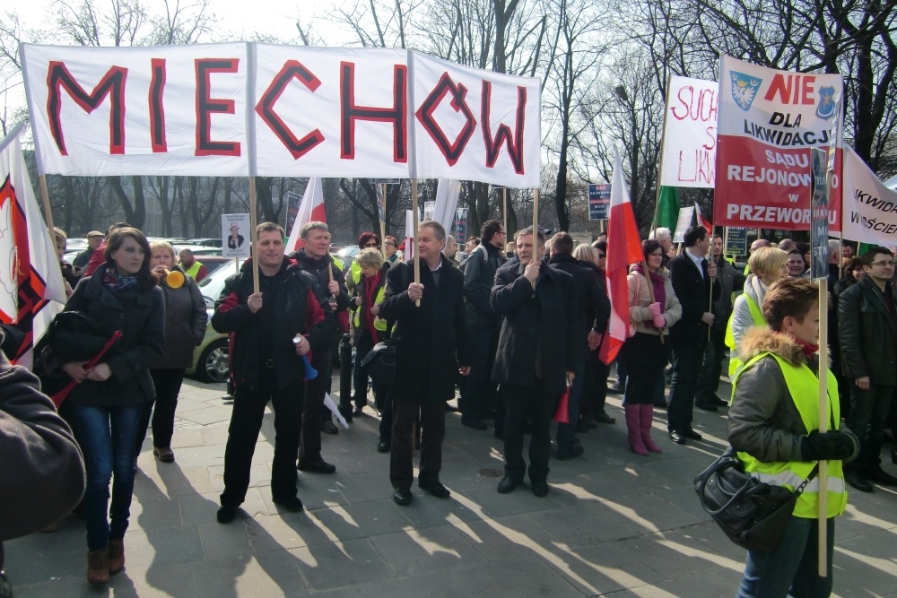 Pikietujący wyrazili swoją dezaprobatę dla zamierzeń ministra sprawiedliwości i resortu najpierw przed budynkiem Sejmu, a następnie przeszli pod siedziby Ministerstwa Sprawiedliwości i Kancelarię Premiera. Niestety, ani minister Jarosław Gowin, ani jego współpracownicy nie spotkali się z protestującymi. Uczynili to natomiast liderzy innych partii. - Jesteśmy tutaj, by bronić naszych miejsc pracy, których jest kilkadziesiąt. Chcemy także bronić instytucji, która na trwałe wpisała się w historię Miechowa i służy nam wszystkim. Obawiamy się jednak, by w nieodległej perspektywie, obecnie tworzone wydziały zamiejscowe nie uległy całkowitej likwidacji - nie kryli niepokoju m.in. Maria Szuba, kierownik Oddziału Administracyjnego sądu i kurator Jerzy Dróżdż. Pracownicy sądu wyrazili zadowolenie z faktu, że zostali wsparci przez przedstawicieli władz powiatowych i miejsko - gminnych i innych miechowskich zakładów pracy. - W naszej ocenie likwidacja Sądu Rejonowego uderza także w prestiż powiatu miechowskiego - stwierdził wicestarosta Bogusław Miś, który przyjechał z radnymi powiatu: przewodniczącym Marianem Brodowiczem, Mariuszem Wolnym, Pawłem Osikowskim i Krzysztofem Świerczkiem. Manifestacje w Warszawie przeprowadziły organizacje związkowe, by zwrócić uwagę na umniejszenie rangi pracowników sądów, ich problemy materialne i chronić miejsca pracy. Kolejna manifestacja jest przewidziana na 30 marca br., również z udziałem miechowskich obrońców Sądu Rejonowego.