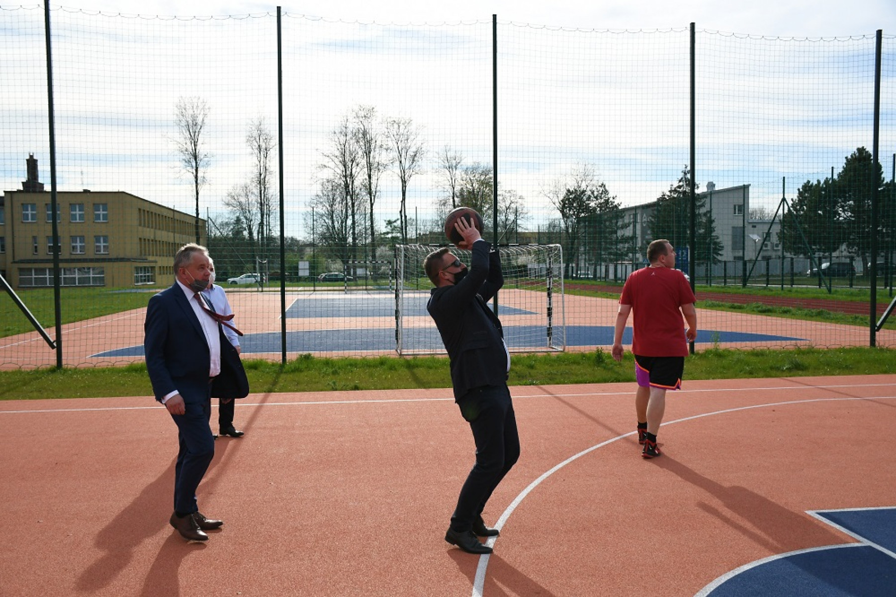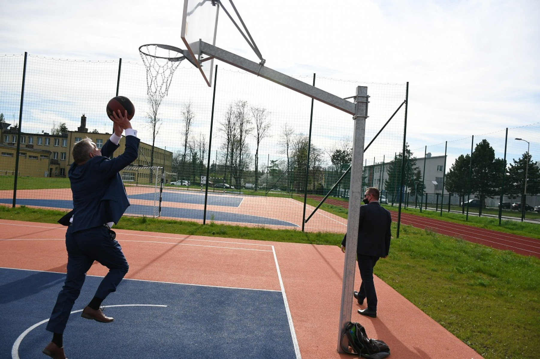 Wiceminister Jacek Osuch testuje boisko do koszykówki Zespołu Szkół Nr 2 w Miechowie