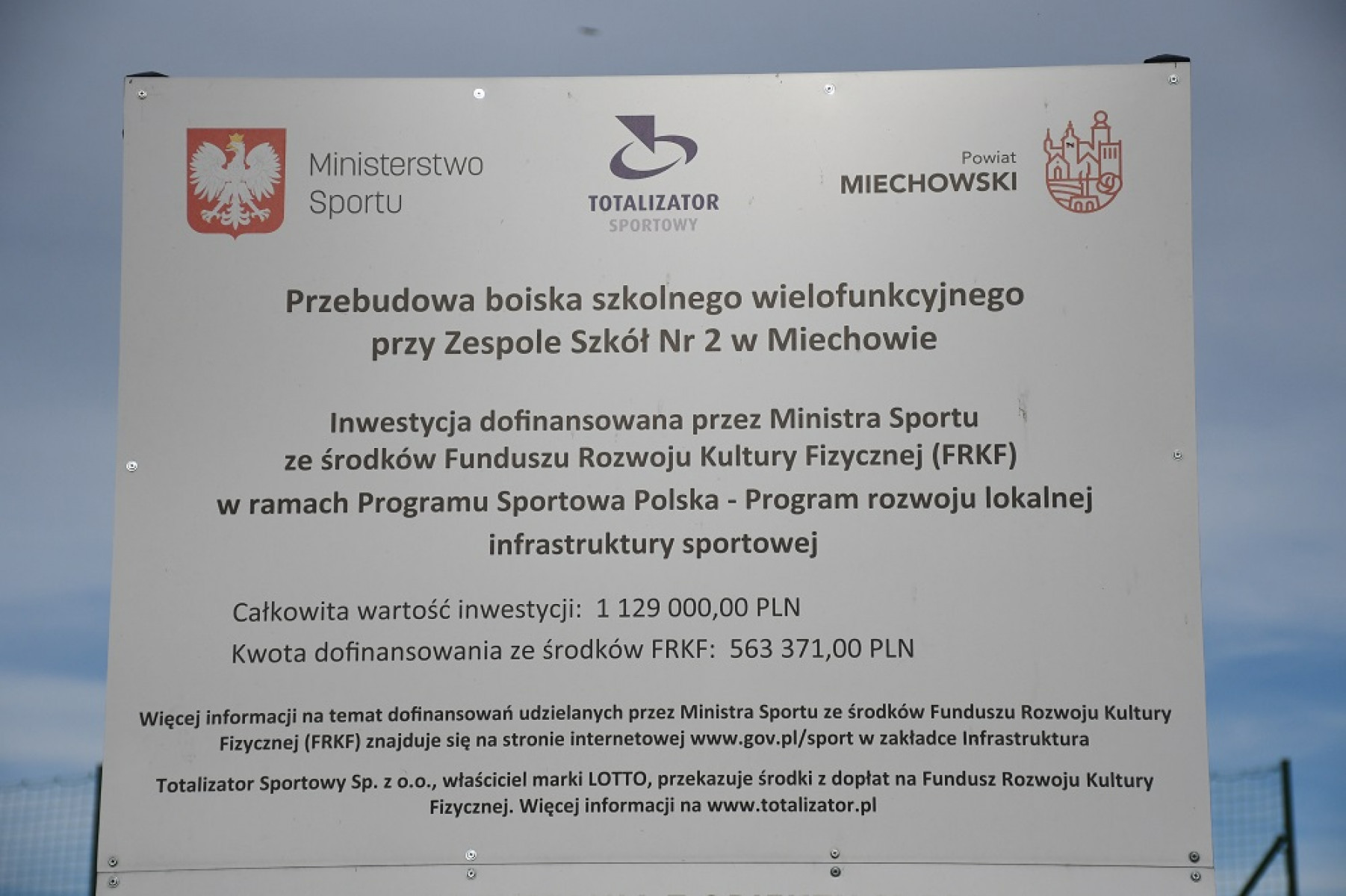 Przypomnijmy, iż boisko przy „Mechaniku” zostało dofinansowane przez Ministra Sportu ze środków Funduszu Rozwoju Kultury Fizycznej (FRKF). Koszt całkowity wyniósł 1 129 000 zł, z czego dofinansowanie - 563 371 zł, udział budżetu Powiatu Miechowskiego - 565 629 zł.