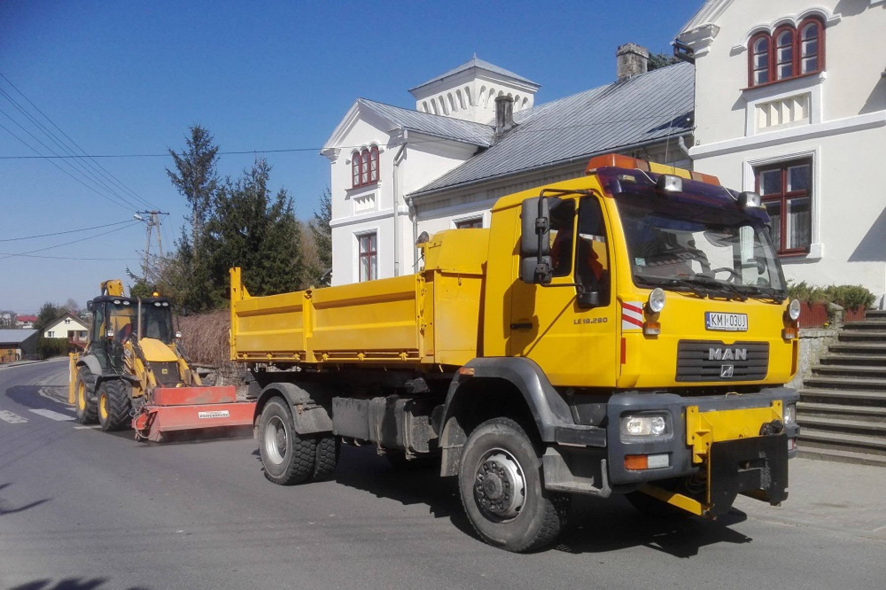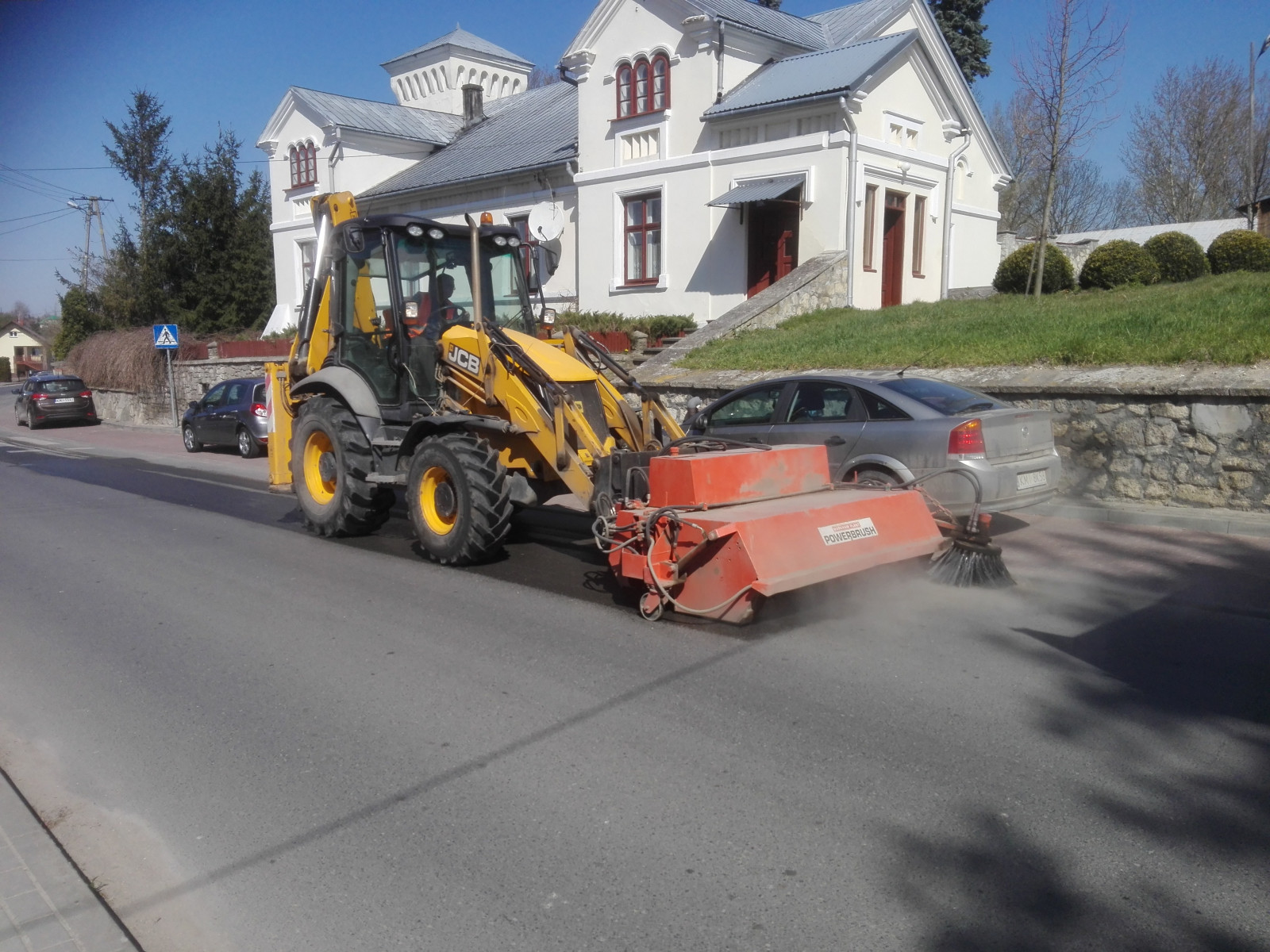 Przed Świętami Wielkanocnymi Zarząd Dróg Powiatowych w Miechowie realizuje sprzątanie dróg i chodników we wszystkich gminach Miechowszczyzny. Na drogi wyjechał sprzęt ZDP - duża zamiatarka podpięta do koparko-ładowarki JCB oraz zakupiony w ostatnim czasie zestaw małej zamiatarki z małym ciągnikiem ramowym LS R60. Wspomaga je samochód ciężarowy MAN wywożący zebrane nieczystości.