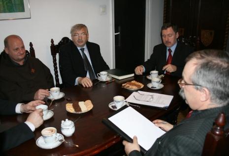 (...) za czasów rycerza Jaksy Gryfity? - na te i podobne pytania będzie można uzyskać znaczną porcję wiadomości w trakcie konkursu edukacyjnego, jaki jest zaplanowany w ramach przyszłorocznych I Dni Jerozolimy w Miechowie. O przygotowaniach do tego konkursu rozmawiano w miechowskim Starostwie. Pomysłodawcy dwudniowej imprezy (11- 12 wrzesień 2010r.), kawalerowie Zakonu Rycerskiego Grobu Bożego - Stanisław Osmenda i Jan Włudarczyk przekonywali, że konkurs dla uczniów szkół różnych szczebli będzie dobrą okazją do popularyzacji wiedzy historycznej, utożsamienia się młodych miechowian z własną ,,małą ojczyzną", popularyzacją Miechowa i powiatu miechowskiego. Zgodni z tą opinią byli starosta Mieczysław Bertek, burmistrz Miechowa Krzysztof Świerczek i naczelnik Wydziału Oświaty, Kultury i Sportu Leonard Mazur. Gościem rozmówców był o. Paschalis Antoni Kwoczała, polski palestynolog, franciszkanin i komisarz Ziemi Świętej na Polskę. O. Paschalis wraz ze swymi współpracownikami zajmuje się od wielu lat popularyzacją historii Ziemi Świętej, organizacją wycieczek pielgrzymkowych w ten rejon świata, duszpasterstwem biblijnym i propagowaniem franciszkańskich misji na Bliskim Wschodzie. Jest także redaktorem naczelnym katolickiego kwartalnika ,,Ziemia Święta". Komisarz z zainteresowaniem przyjął propozycję kawalerów ZRGB i władz miechowskich dotyczącą współpracy przy przeprowadzeniu wśród miechowskich uczniów cyklu wykładów poświęconych dziejom Ziemi Świętej i bożogrobcom. O.Paschalis i jego współpracownicy poprowadzą w miechowskich szkołach cykl multimedialnych wykładów i dostarczą przydatne wydawnictwa. Ustalono, że konkurs obejmie uczniów szkół podstawowych, gimnazjów i szkół ponadgimnazjalnych. Nad stroną organizacyjną przedsięwzięcia będą czuwać stosowne komórki obu samorządów - Starostwa i Urzędu Gminy i Miasta Miechów. W najbliższych dniach zostanie opracowany regulamin konkursu wiedzy o Ziemi Świętej i Zakonie Bożogrobców. Cykl wykładów popularyzujących ww. tematykę zostanie przeprowadzony w I kwartale przyszłego roku, zaś sam konkurs w kwietniu. Zwycięzcy w kategoriach poszczególnych szkół otrzymają atrakcyjne nagrody. Wyniki konkursu zostaną ogłoszone w czasie wrześniowych I Dni Jerozolimy w Miechowie.