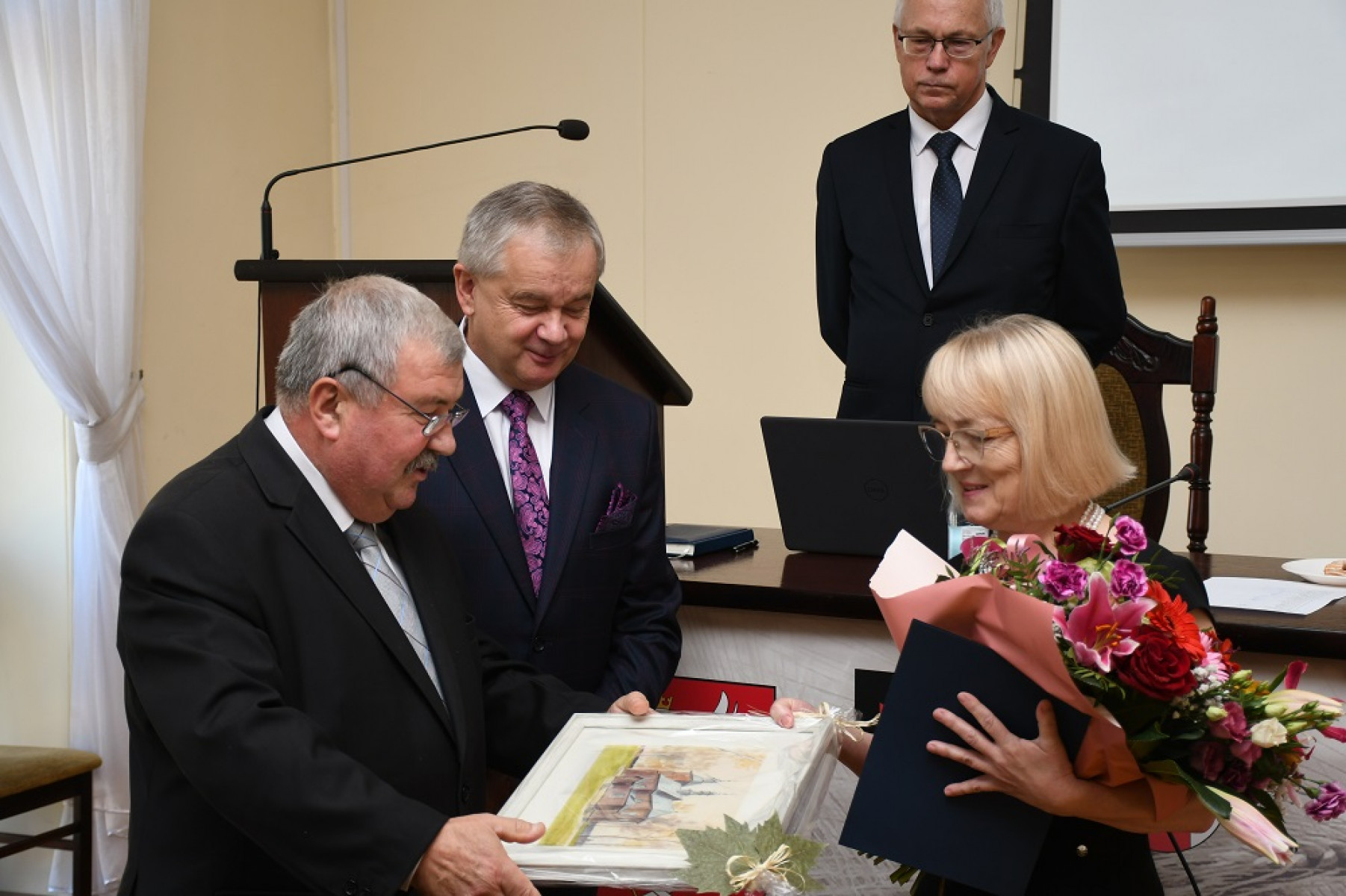Starosta Jacek Kobyłka i Przewodniczący Rady Powiatu Krzysztof Świerczek wręczają Marii Słuszniak pamiątkową grafikę Marka Hołdy