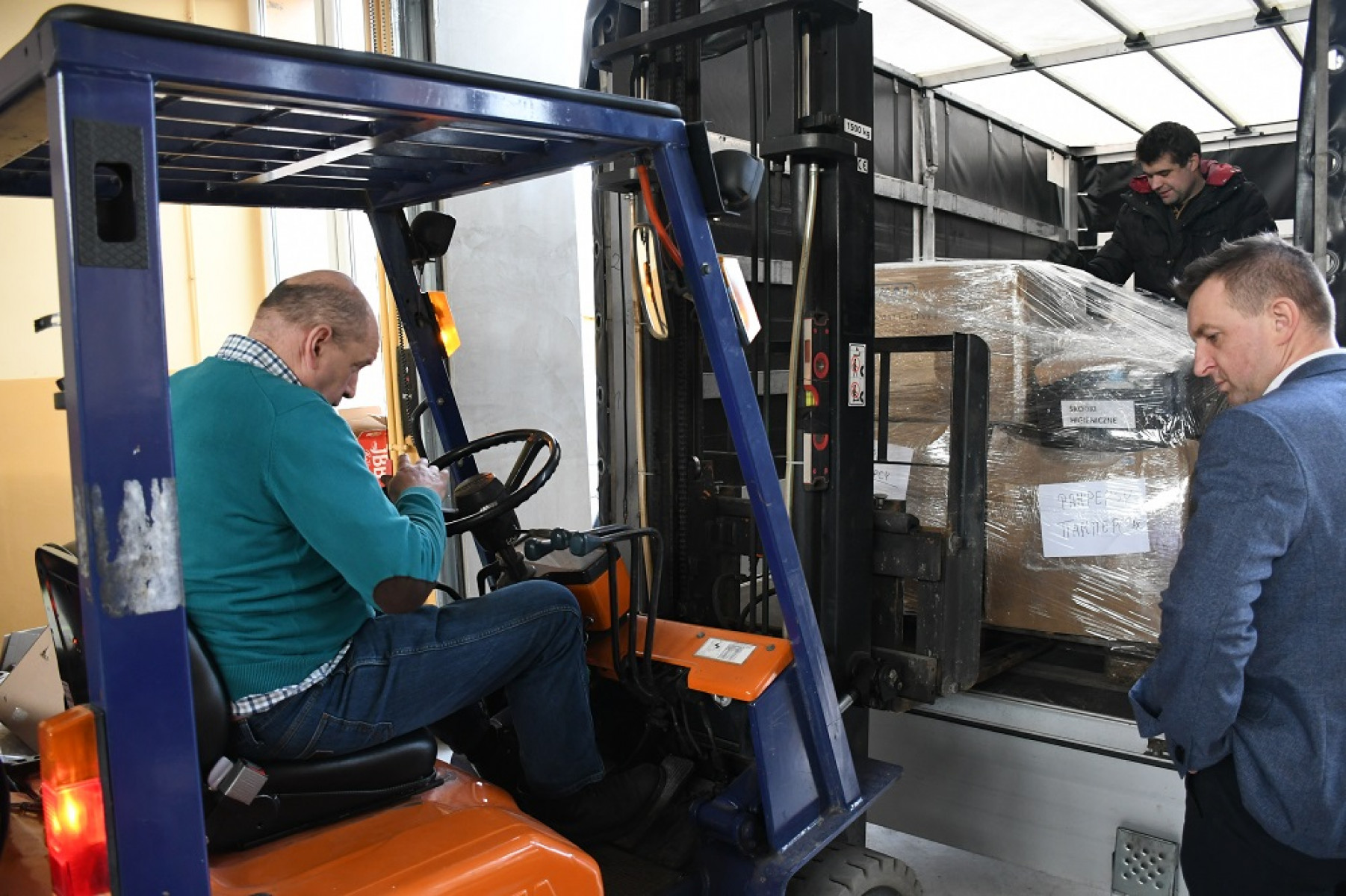 Pakowanie kolejnego transportu z PPM w Miechowie do Przemyśla