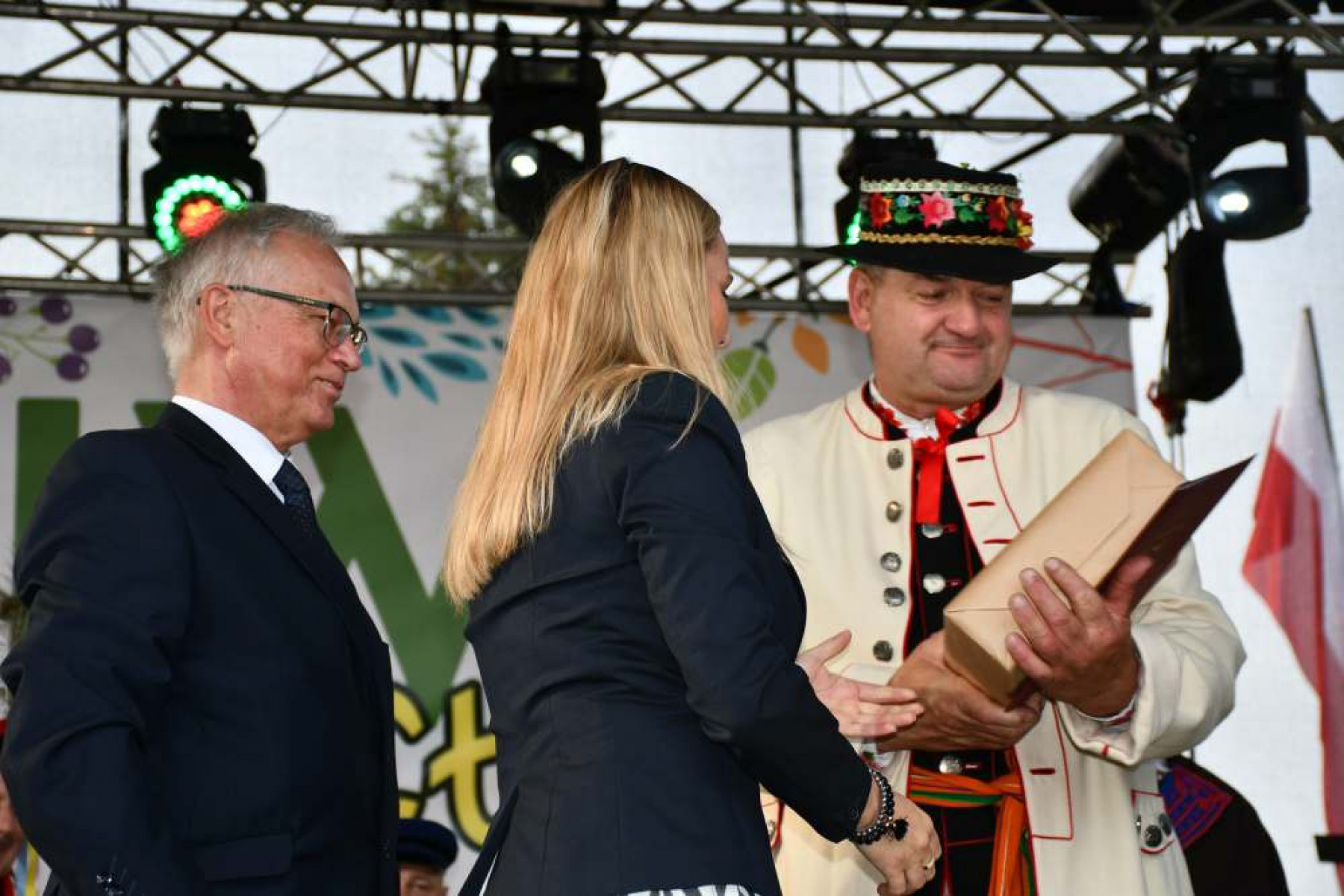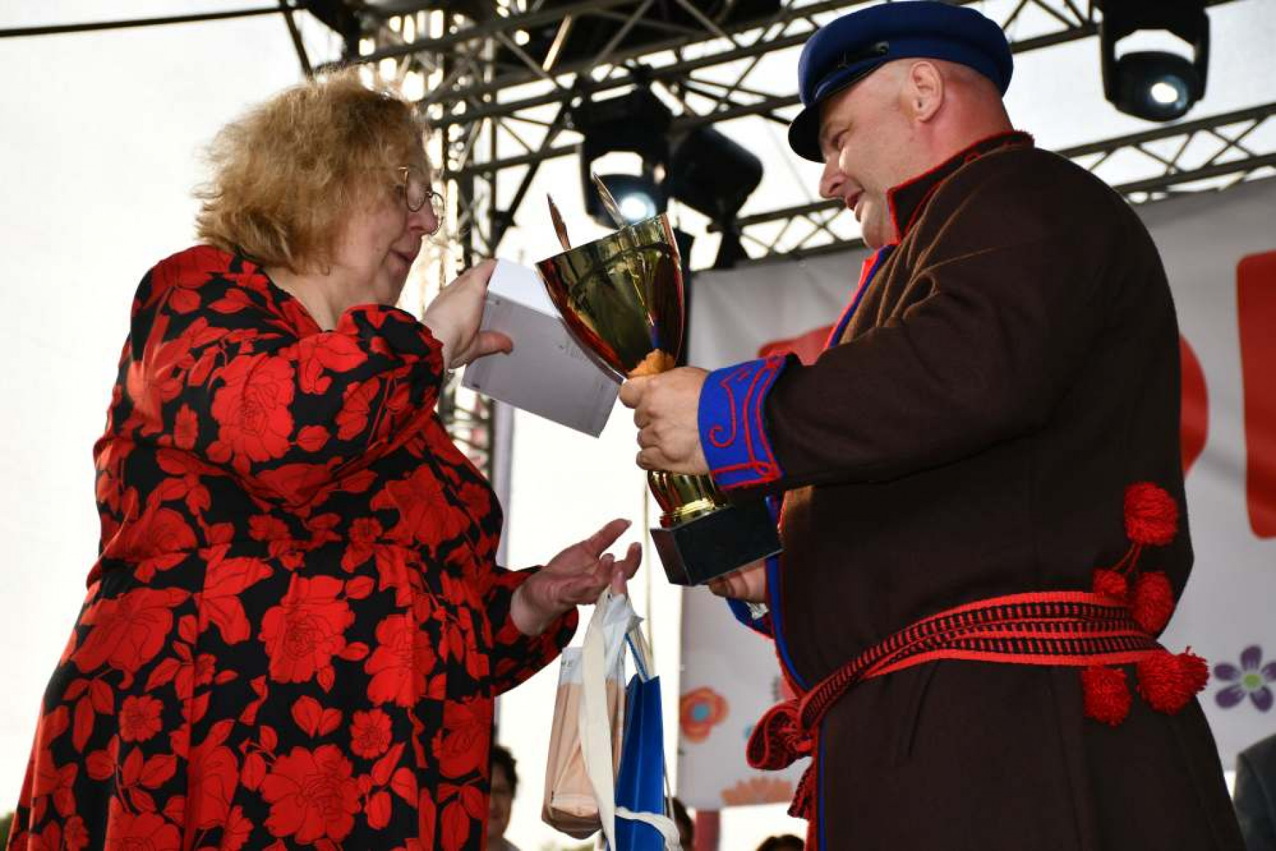 Wybory Chłopa Roku 2023 - Grzegorz Kosowicz odbiera puchar od Wicewójt Małgorzaty Sadowniczyk