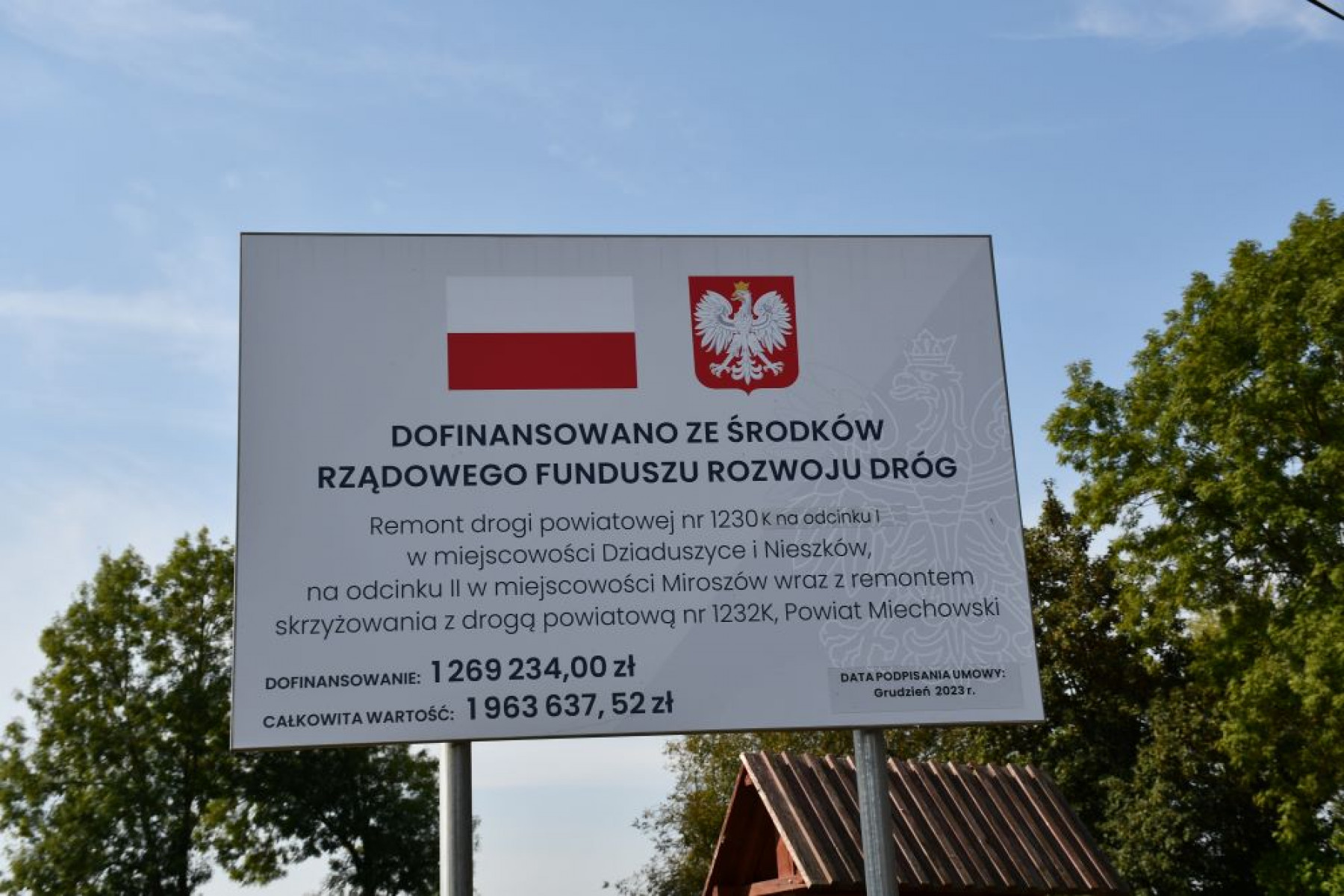 Droga powiatowa nr 1230K na odcinku I - w km od 0+000 do km 2+600 i na odcinku II - w km od 4+485 do km 5+365 (skrzyżowanie z drogą powiatową nr 1232K w km 5+073) w miejscowości Dziaduszyce, Nieszków i Miroszów - została wyremontowana.